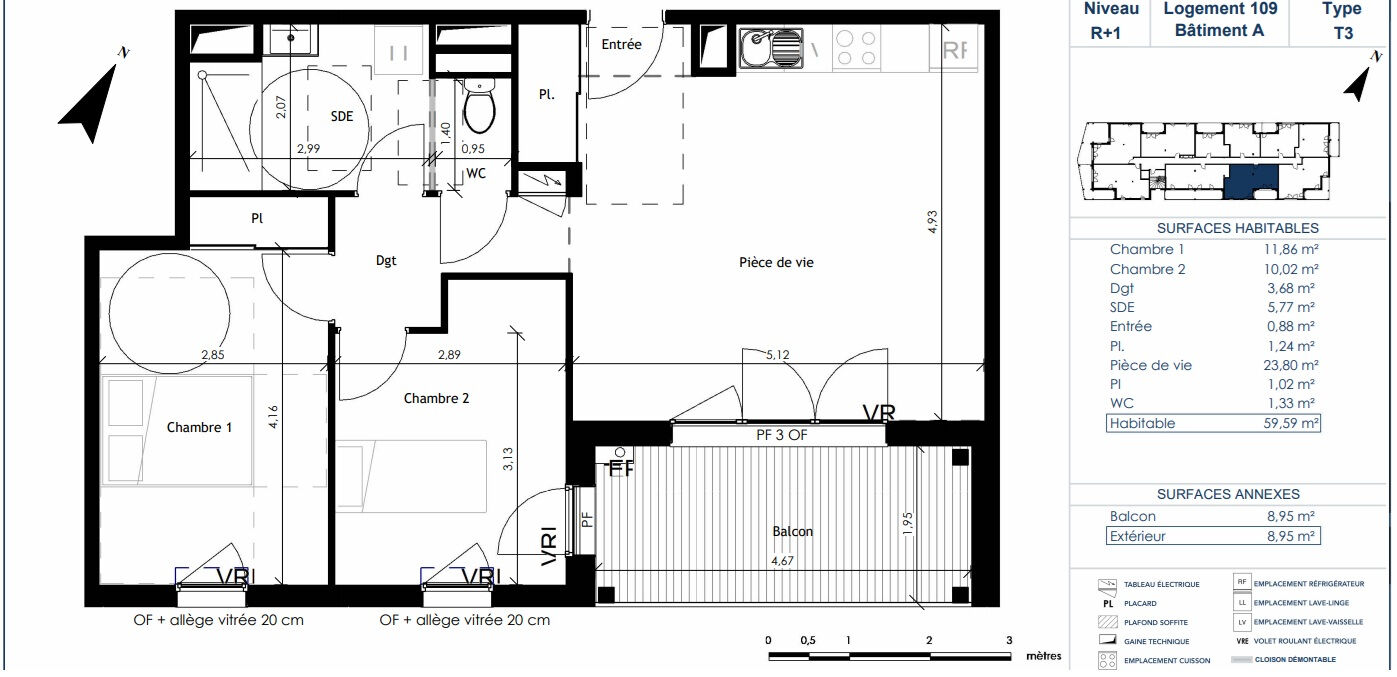 A VendreT3 de 59,59 m², situé au 1er étage, comprenant une pièce de vie de 23,80m² avec cuisine, ouvrant sur un balcon de 8,95 m² Il se compose de deux chambres, d'une salle d'eau et WC séparés et de rangements.
