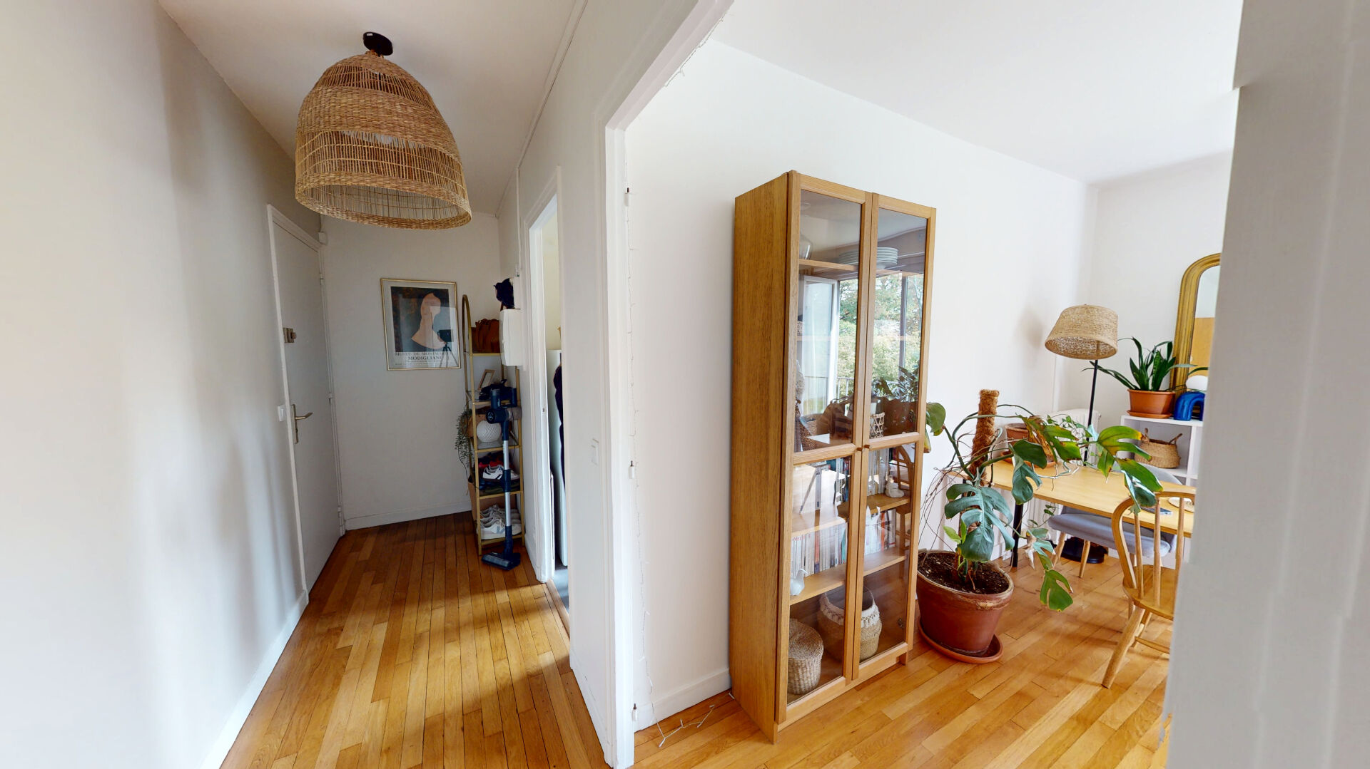 8 minutes gare et commerces, dans résidence en pierre de taille, beau deux pièces lumineux et en excellent état offrant : entrée, cuisine aménagée, séjour parqueté, possibilité d'ouvrir la cuisine sur le séjour, couloir desservant, wc indépendant, salle de bains, chambre avec grand dressing, ouvrant sur balcon donnant sur parc.