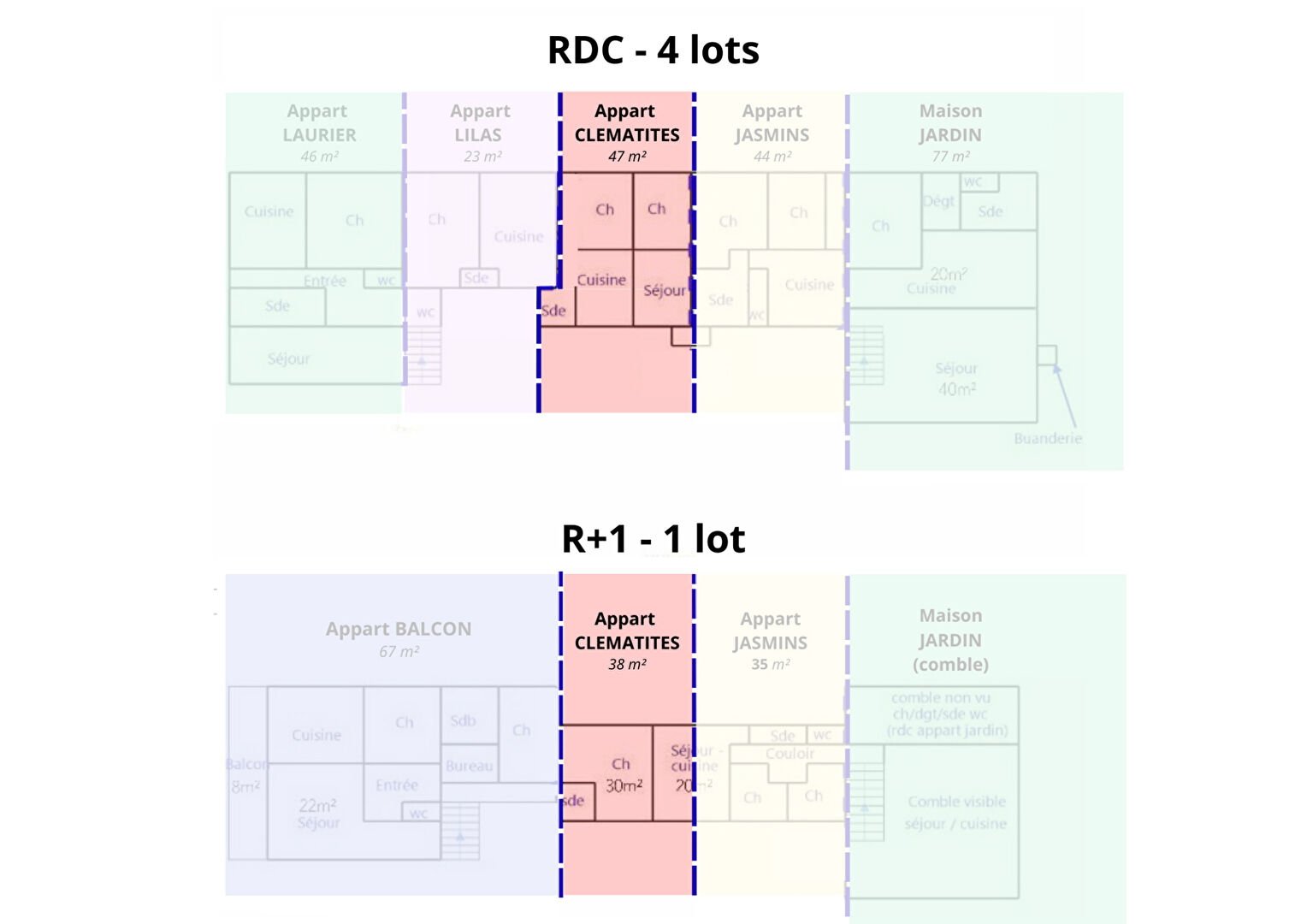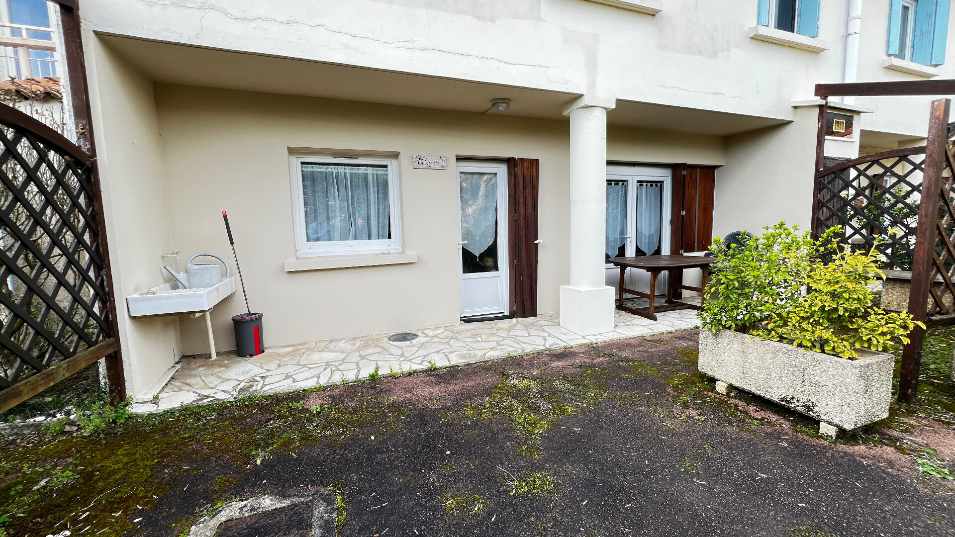 Dans une petite copropriété, au rez-de-jardin : deux chambres, cuisine, salon, salle d'eau et wc indépendant. A l'étage : salon, salle d'eau avec WC. A l'extérieur : une terrasse, jardin à l'opposé et un parking.