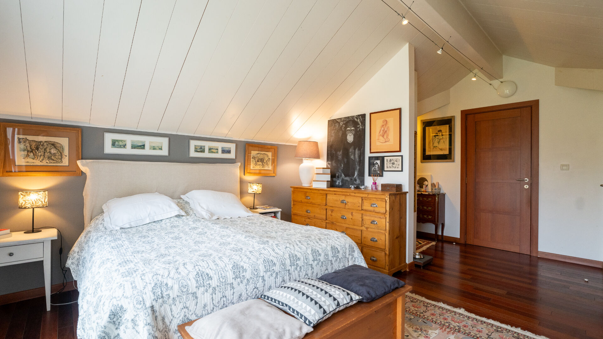 À l'étage, l'espace nuit se distingue par son confort et son élégance. Découvrez trois chambres, dont une suite parentale avec dressing sur mesure et salle d'eau privative. L'une des chambres bénéficie d'une vue imprenable sur le Salève, tandis qu'une autre profite d'une vue entièrement dégagée, offrant un cadre paisible et privilégié. Une salle de bains supplémentaire, un espace bibliothèque et un bureau viennent compléter cet étage.