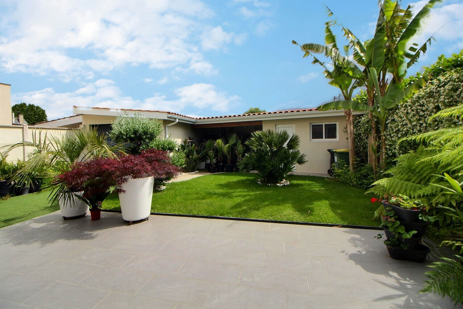 Terrasse dinatoire carrelée plein Est donnant sur un jardin paysagé, garage clos (possibilité de rentrer plusieurs voitures en plus), abris couvert et atelier fermé.