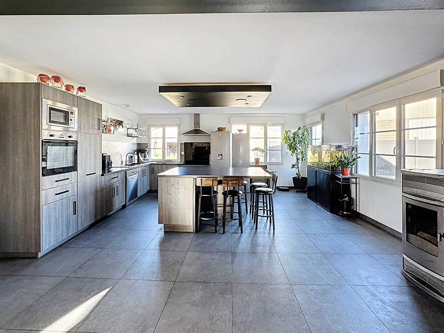 Dès l'entrée, la pièce de vie inondée de lumière instaure une ambiance chaleureuse. Elle s'articule autour d'un poêle à granulés et s'ouvre naturellement sur une cuisine aménagée et équipée, créant un espace convivial et harmonieux.