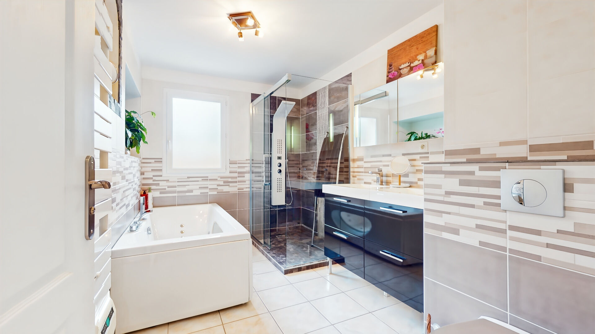 A l'étage, 4 chambres avec placards intégrés, une salle de bains complète avec baignoire balnéo, douche à l'italienne, double vasque, sèche-serviettes et WC.