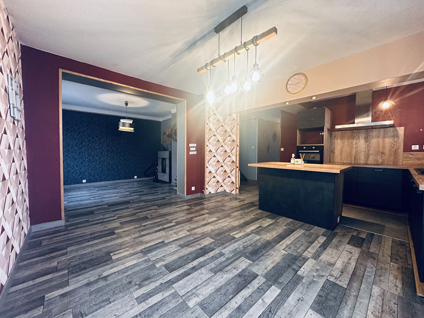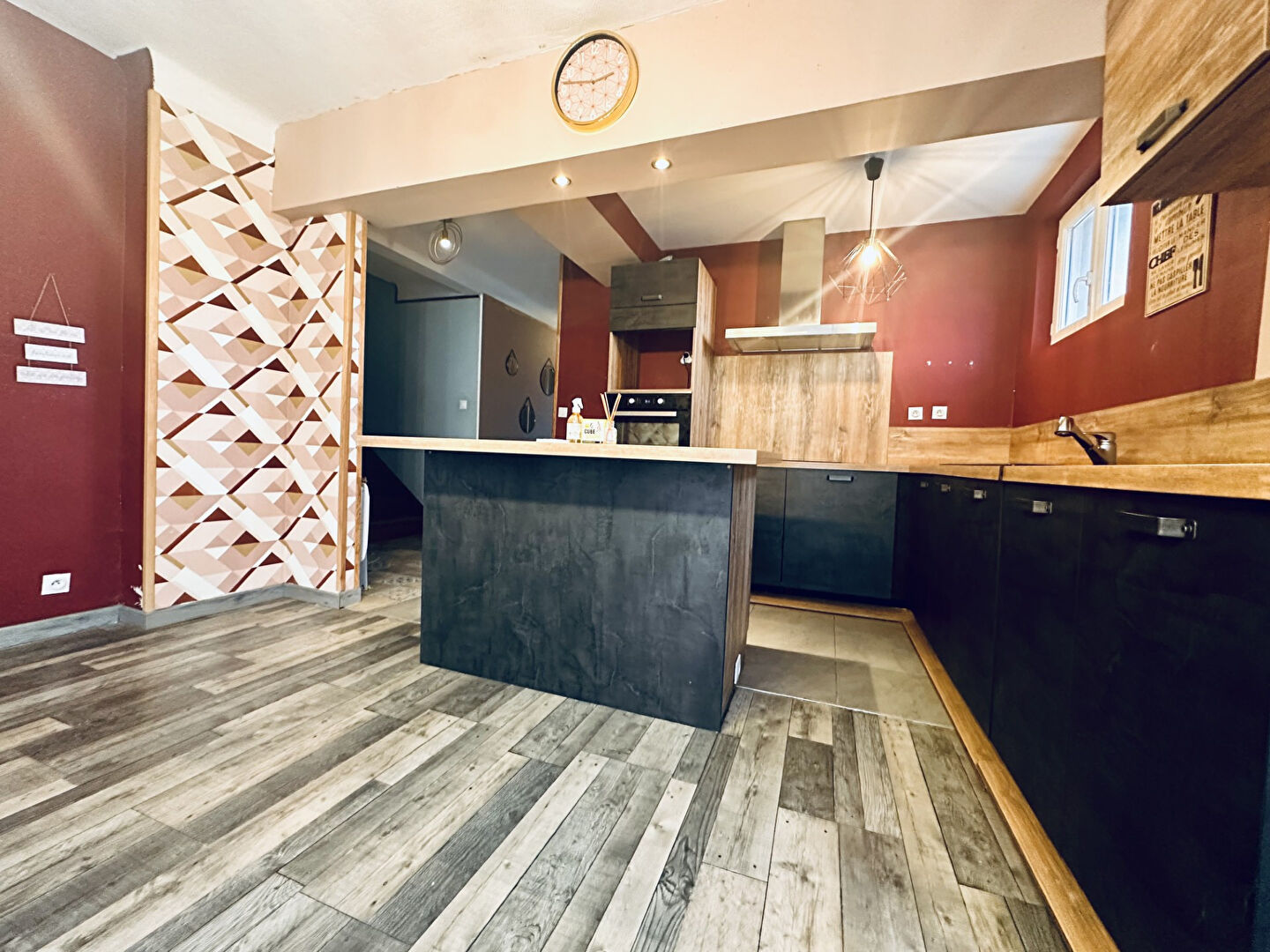 Dès l'entrée, vous découvrirez au rez-de-chaussée un bel espace de vie lumineux et convivial, composé d'une cuisine équipée ouverte sur le salon et la salle à manger.