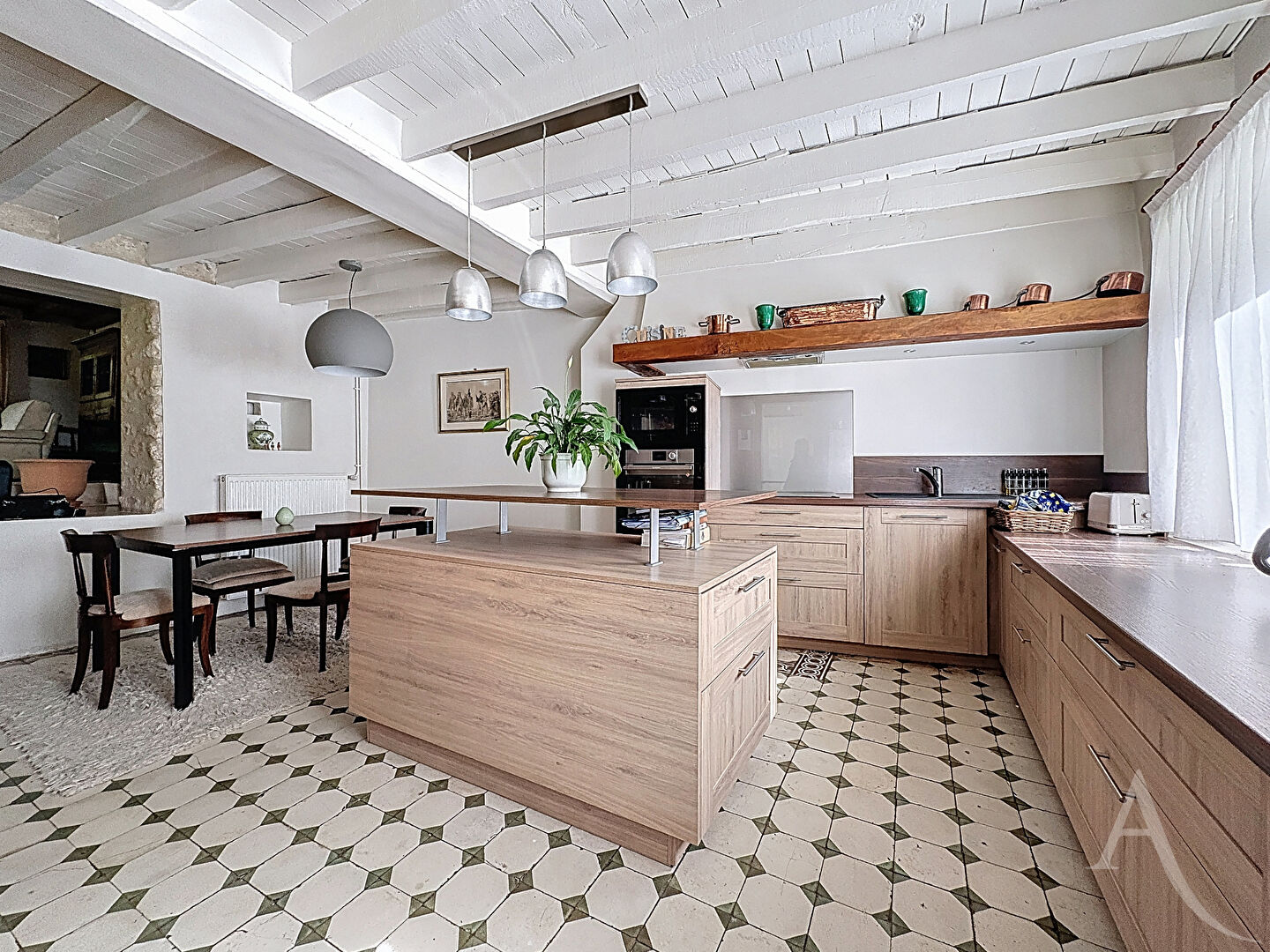Une entrée offrant un dégagement avec wc, une grande cuisine aménagée équipée avec son coin repas, buanderie chaufferie, un très beau salon cathédrale de 40m² avec cheminée à foyer ouvert, pièce débarras.