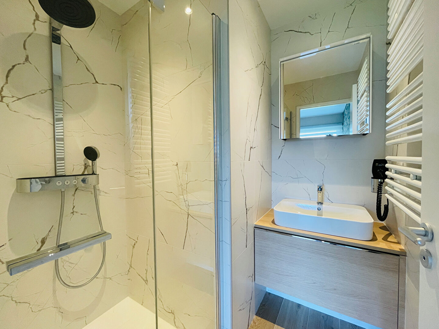 Composée d'un hall d'entrée, d'une cuisine équipée, d'un vaste séjour avec insert et accès à la terrasse. Une chambre, un espace sauna avec salle d'eau et wc complètent le RDC.