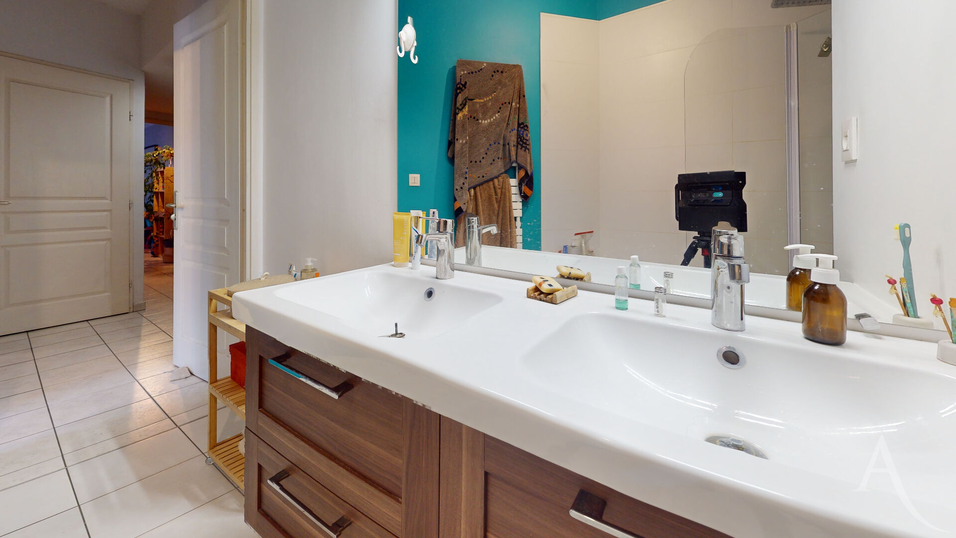 Il se compose d'une cuisine équipée ouverte sur le salon avec terrasse avec store bann, de deux chambres avec placards, d'une salle de bain et d'un wc séparés.
