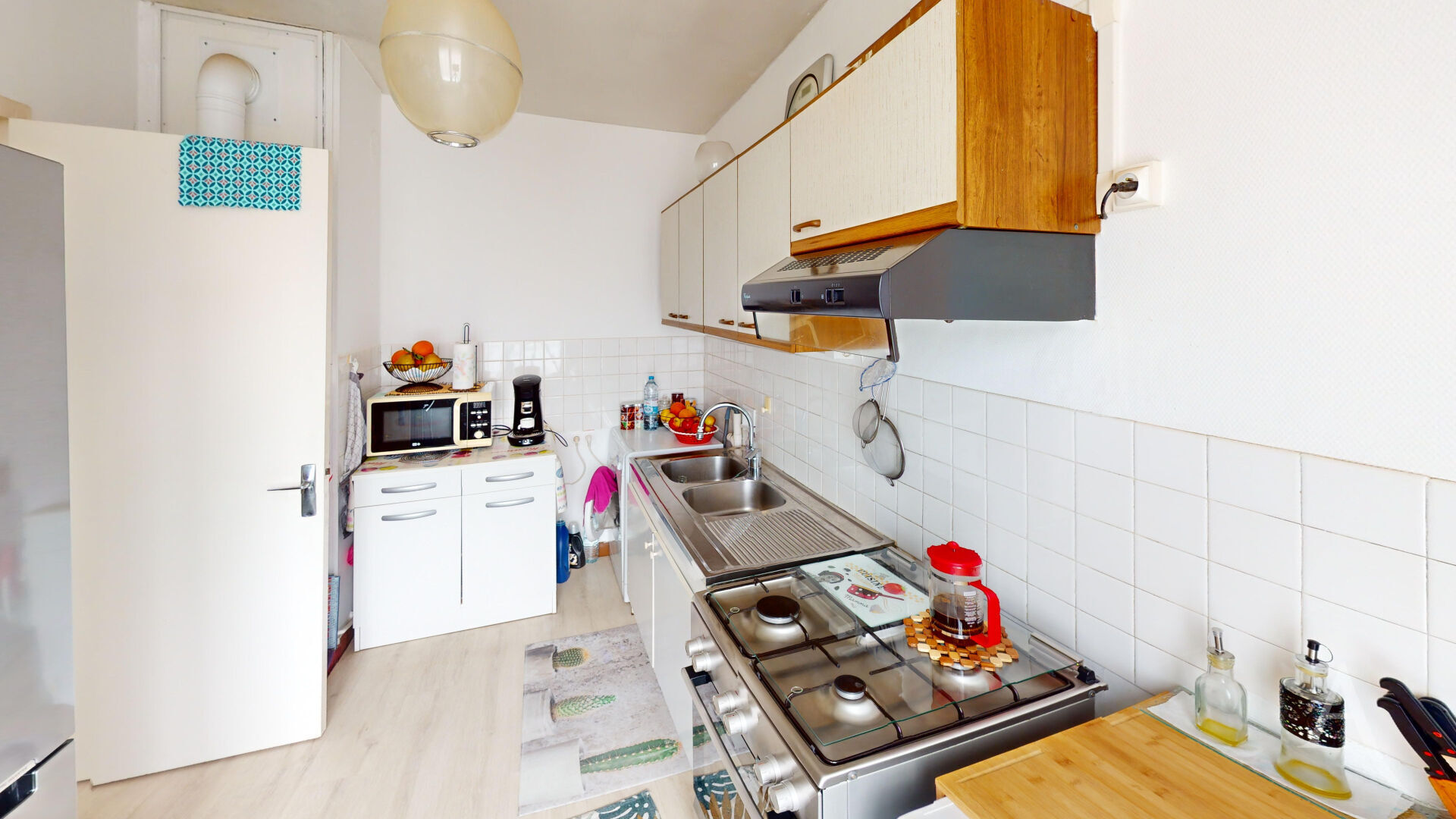 Une entrée desservant une cuisine aménagée mais seulement équipée d'une hotte, un salon-séjour, un dégagement avec placards, deux chambres, une salle d'eau et WC indépendant.