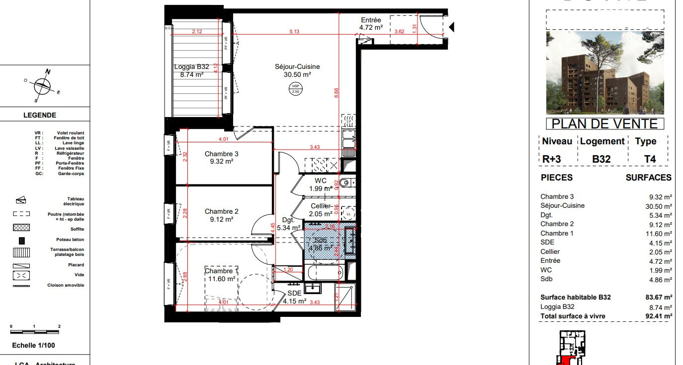 A VENDRE appartement Type T4 Neuf de 83,67m² situé au 3ème étage de la résidence et comprenant un séjour cuisine de 30,50m² ouvert sur une loggia de 8,74m² orienté Ouest, un cellier, trois chambres dont une avec salle d'eau privative , une seconde salle de bains avec WC séparé. Une place de parking privative et sécurisée complète les lieux,