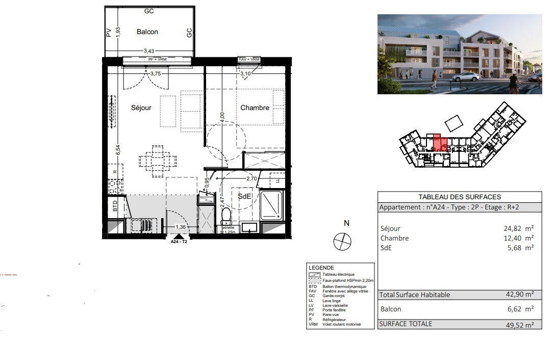 A VENDRE appartement Type T2 Neuf de 42,90m² situé au 2ème étage de la résidence et comprenant un séjour cuisine de 24,82m² ouvert sur un balcon de 6,62m², une chambre de 12,40m² une salle d'eau avec WC . Une place de parking privative et sécurisée complète les lieux,