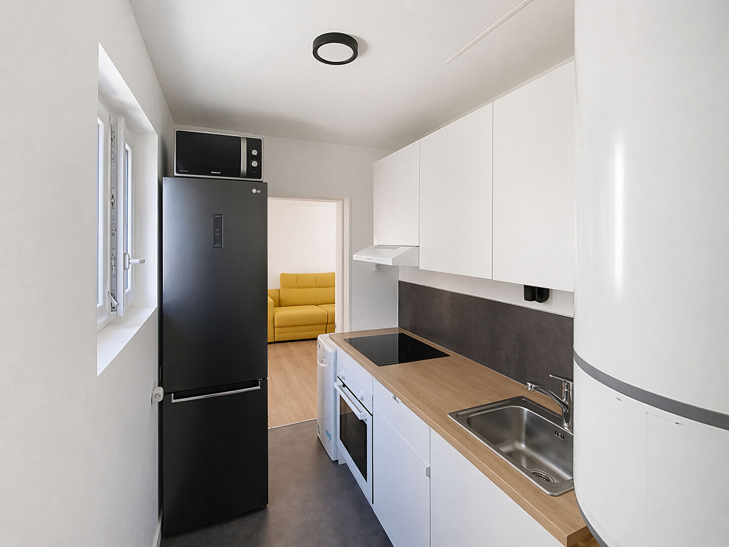 La cuisine indépendante, aménagée et équipée (four, plaque, hotte), deux chambres, une salle de bains équipée d'une baignoire et d'un sèche-serviettes, ainsi que des WC séparés.