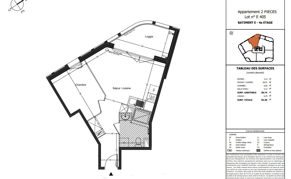 A VENDRE  appartement Type T2 Neuf de 38,74m² situé au 4ème étage de la résidence et comprenant un séjour cuisine de 20,91m² ouvert sur une loggia de 6,74m² , une chambre de 9,56m² une salle d'eau avec  WC . Une place de parking  complète les lieux,
