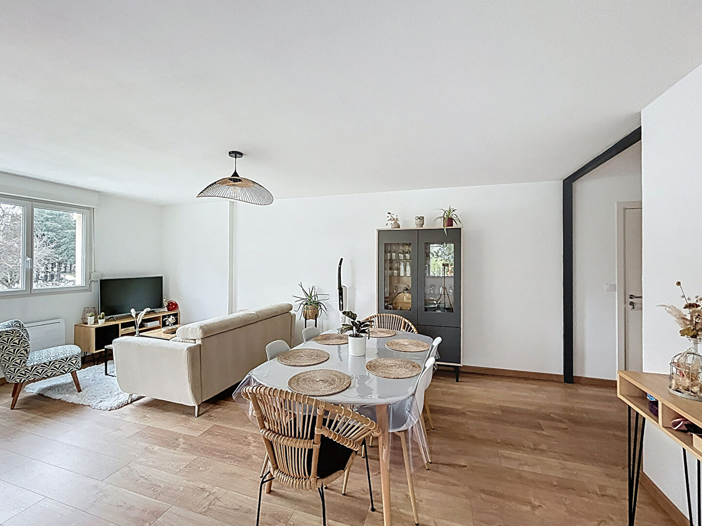 Dès l'entrée, un placard intégré permet de s'organiser facilement. La pièce de vie, spacieuse et lumineuse, s'ouvre sur une terrasse couverte où l'on peut profiter d'un moment au calme, quelle que soit la saison. La cuisine, récente, aménagée et équipée, s'intègre harmonieusement à l'espace et offre un vrai confort au quotidien.