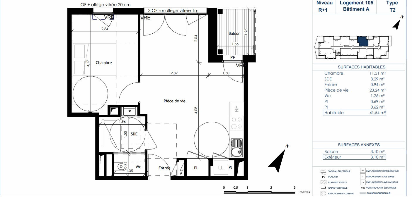 A vendre T2 de 41,54 m², situé au 1er étage, comprenant une pièce de vie avec cuisine de 23,24 m² ouvrant sur un balcon de 3,10 m². Il dispose d'une chambre de 11,51 m², d'une salle d'eau, de WC séparés et de rangements.
