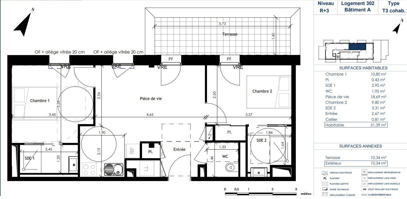 A VendreT3 de 51,39 m², situé au 3? étage, comprenant une pièce de vie de 18,69 m² avec cuisine, ouvrant sur une terrasse de 10,34 m². Il se compose de deux chambres, de deux salles d'eau, de WC séparés et de rangements.