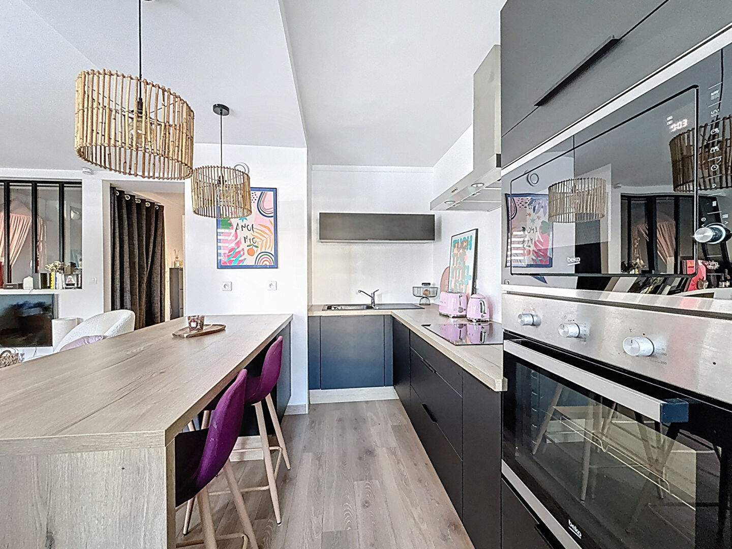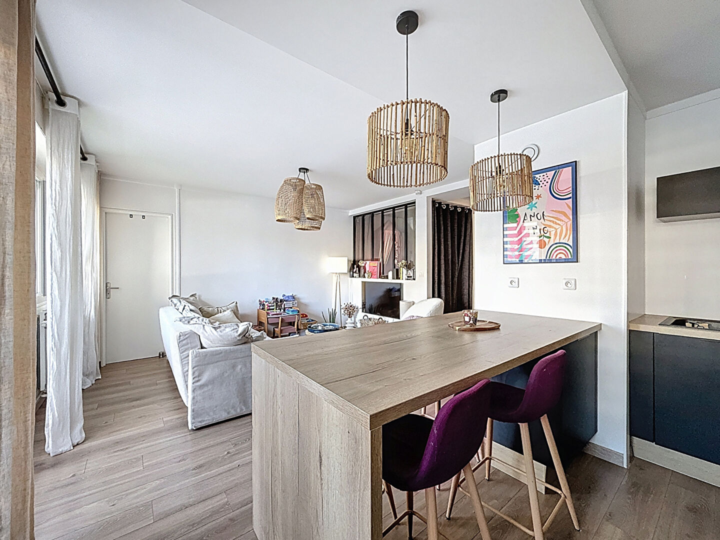 L'appartement offre une pièce de vie baignée de lumière, agrémentée d'une cuisine aménagée et équipée.