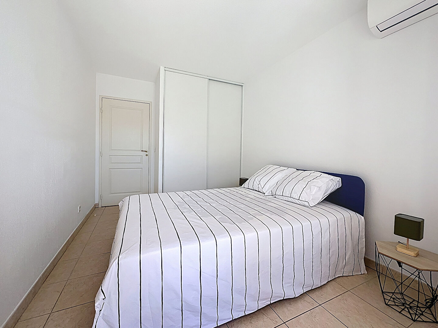 La chambre avec un placard aménagé donne elle aussi sur la terrasse et elle est équipée de la climatisation réversible.
