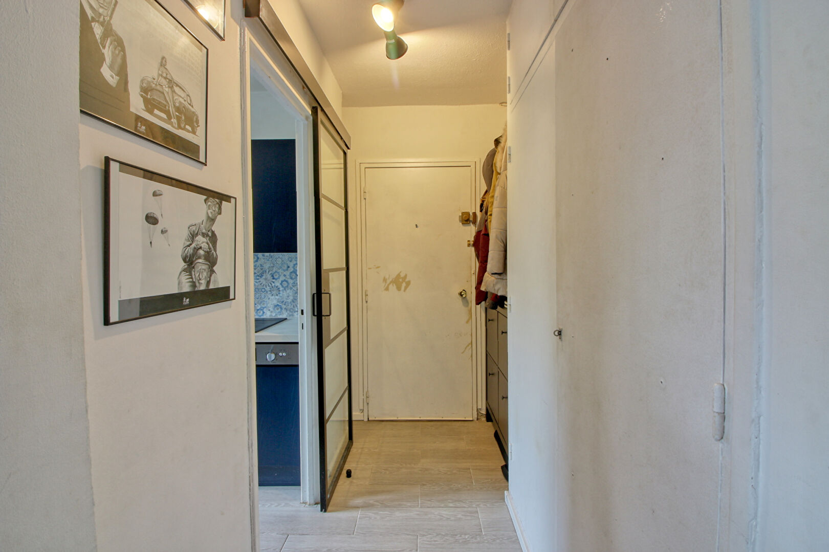 Partie jour : entrée avec placards, séjour ouvrant sur balcon exposé SUD, cuisine équipée indépendante, cellier avec coin buanderie.