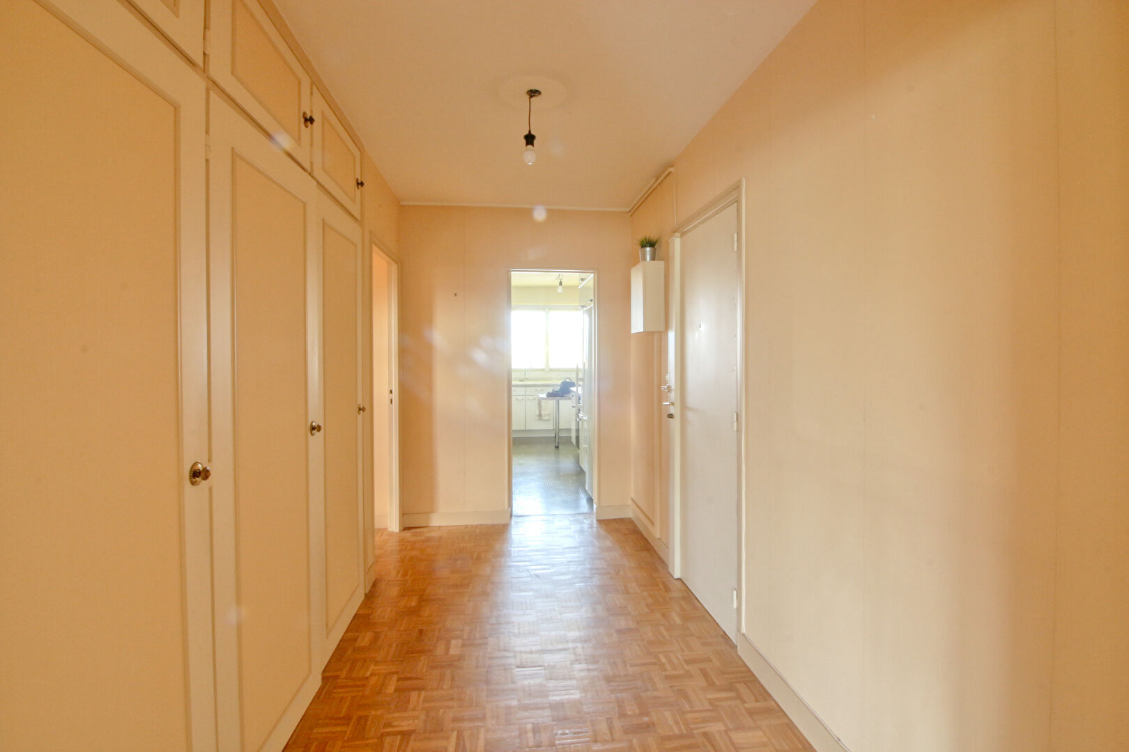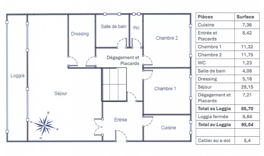 Appartement 4 pièces comprenant: une entrée avec placards de capacité de rangement importante, une cuisine aménagée, deux chambres , un salon séjour donnant sur une très grande loggia fermée( environ 10m²) supplémentaire, la salle à manger pouvant devenir la troisième chambre, une salle de bains, un wc, un dressing, un couloir avec de nombreux rangements, un cellier (environ 4m²) et un parking privatif extérieur