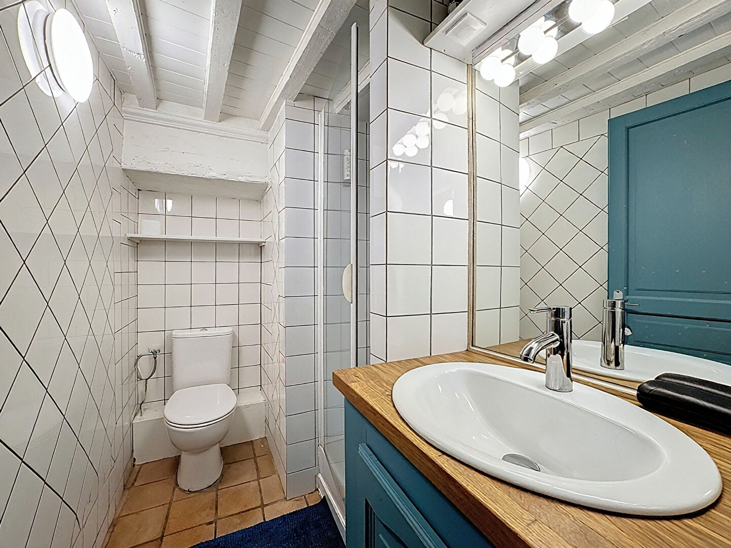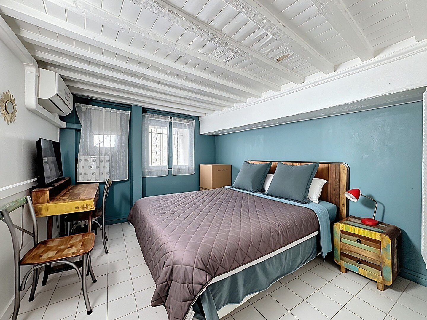 Au 1er étage, il se compose d'un séjour lumineux avec cuisine entièrement aménagée et équipée, d'une chambre indépendante, ainsi que d'une salle d'eau avec WC. La chambre et la pièce principale sont climatisées, assurant un confort optimal toute l'année.