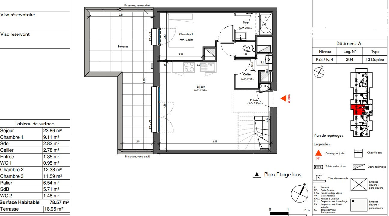 A vendre T4 en duplex de 78,57 m² se compose d'un séjour avec cuisine de 23,66 m², orienté Sud-Ouest, ouvrant sur une terrasse de 18,95 m². Le niveau bas comprend également une chambre avec salle d'eau privative, un cellier et des WC séparés.