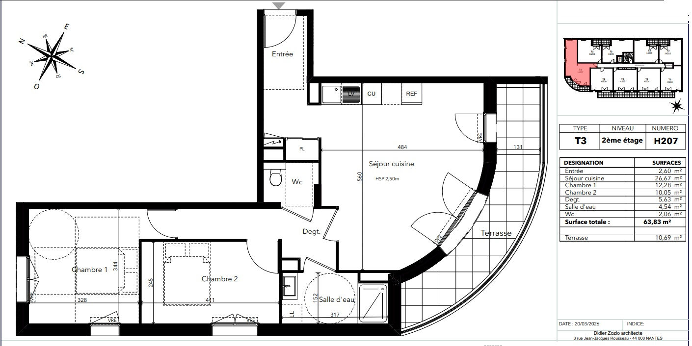 A VENDRE appartement T3 de 63,83m² situé au 2ème étage , comprenant une entrée, un séjour cuisine de 26,67m² , deux chambres de 10,05m² et 12,28m², une salle d'eau et WC séparé.