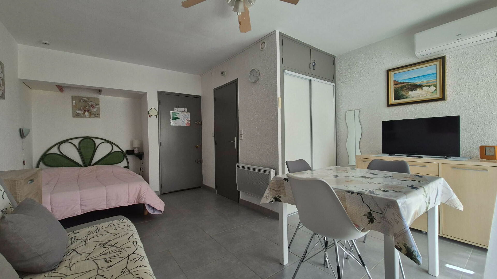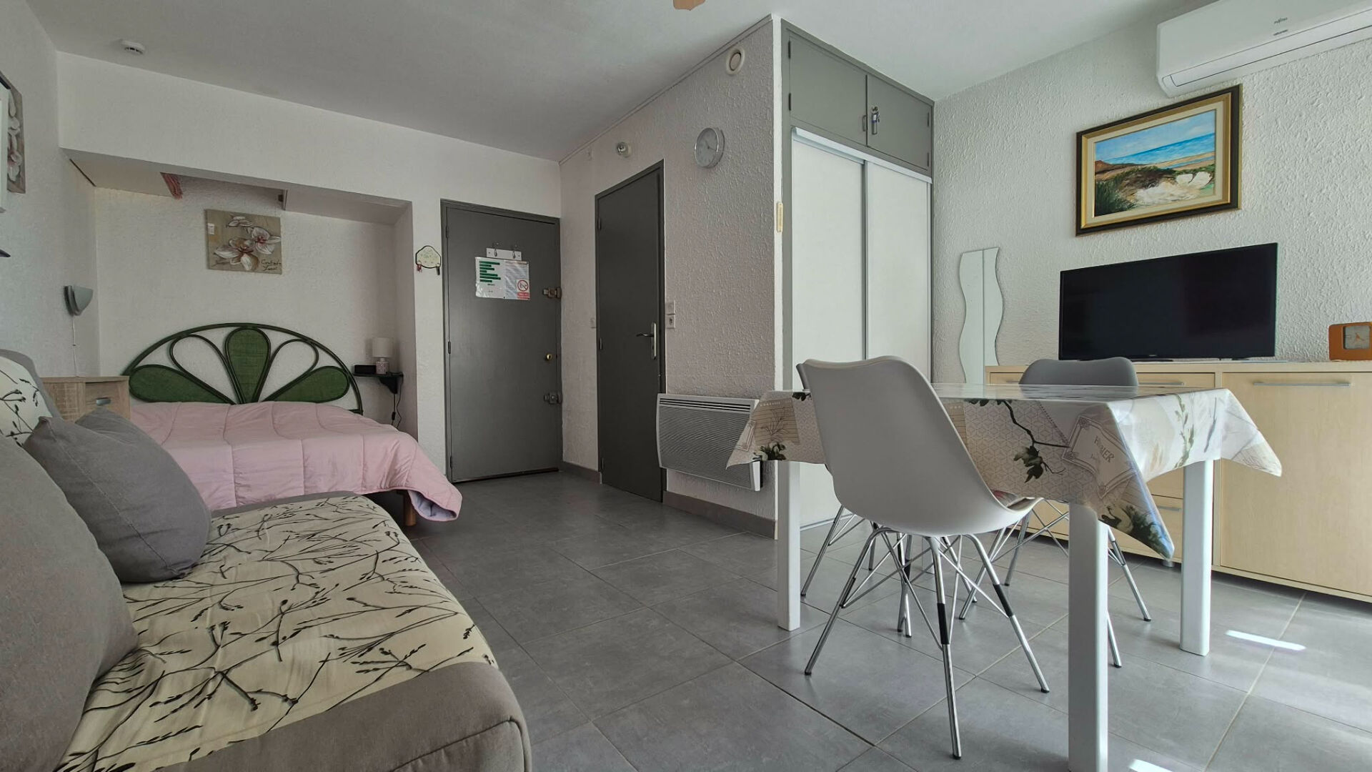 Le studio est équipé de la climatisation, garantissant un confort optimal en toute saison. Une cave commune est à disposition, notamment pour le stationnement de vélos, un vrai plus pour profiter pleinement des alentours.