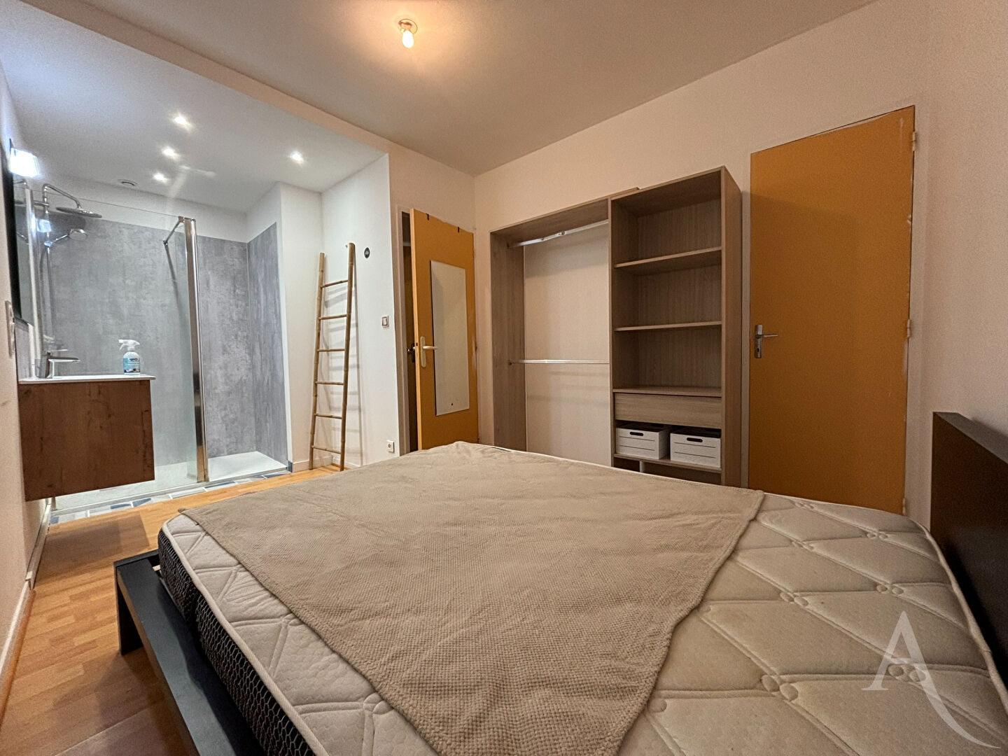 Il se compose d'une entrée avec placard, d'une chambre avec placard et salle d'eau, de wc indépendants. Ensuite, vous montez quatre marches pour accéder à la pièce de vie avec un espace salon et la cuisine récente aménagée et équipée avec son coin salle à manger.