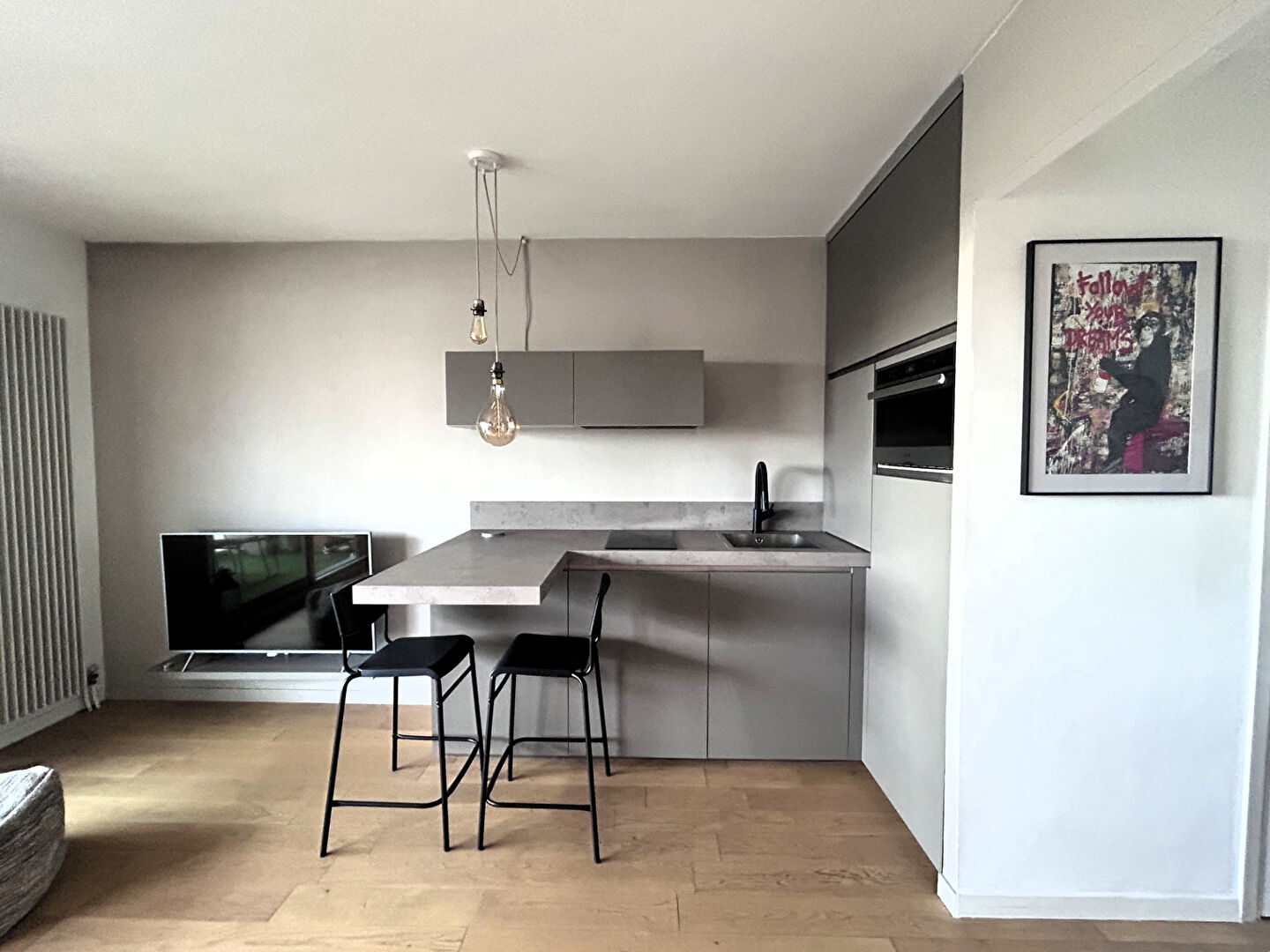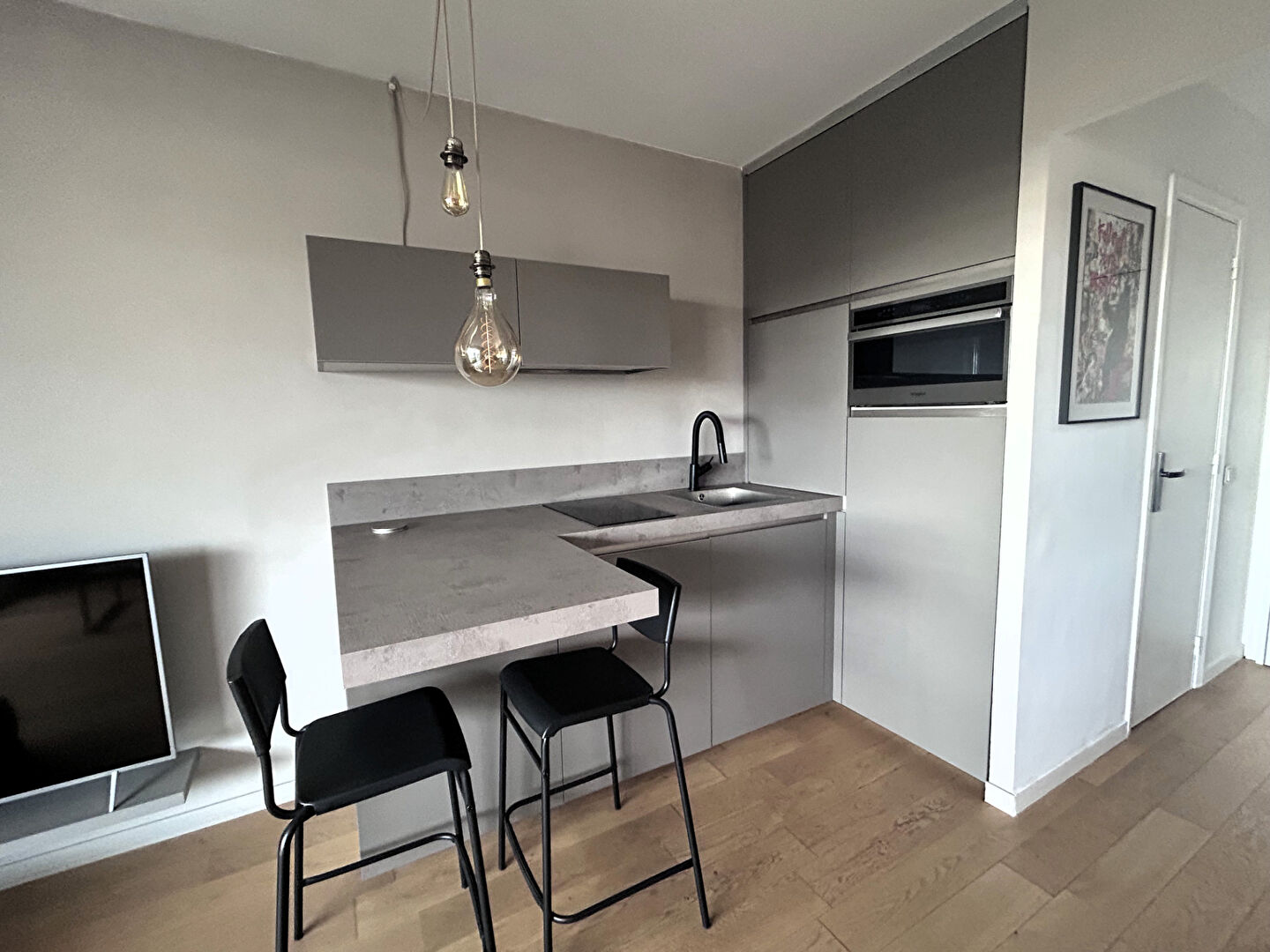 Il est composé d'une entrée, d'un dressing, d'une salle d'eau avec wc et d'une pièce de vie avec sa cuisine aménagée et équipée.