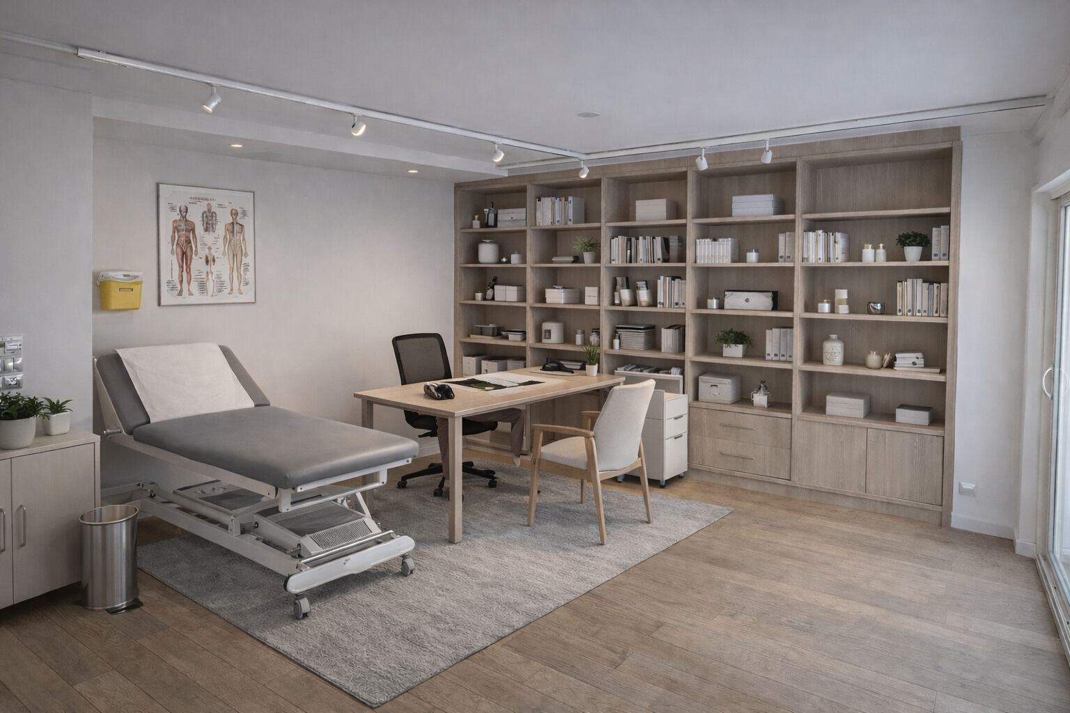 Depuis le salon, un escalier mène à l'étage inférieur où se trouve un grand deux-pièces indépendant avec une pièce principale (pouvant être aménagée en bureau ou cabinet médical) donnant sur une large terrasse, une chambre, une salle de bains avec WC aux normes PMR, une cuisine aujourd'hui aménagée en buanderie, ainsi que de nombreux espaces de rangement.