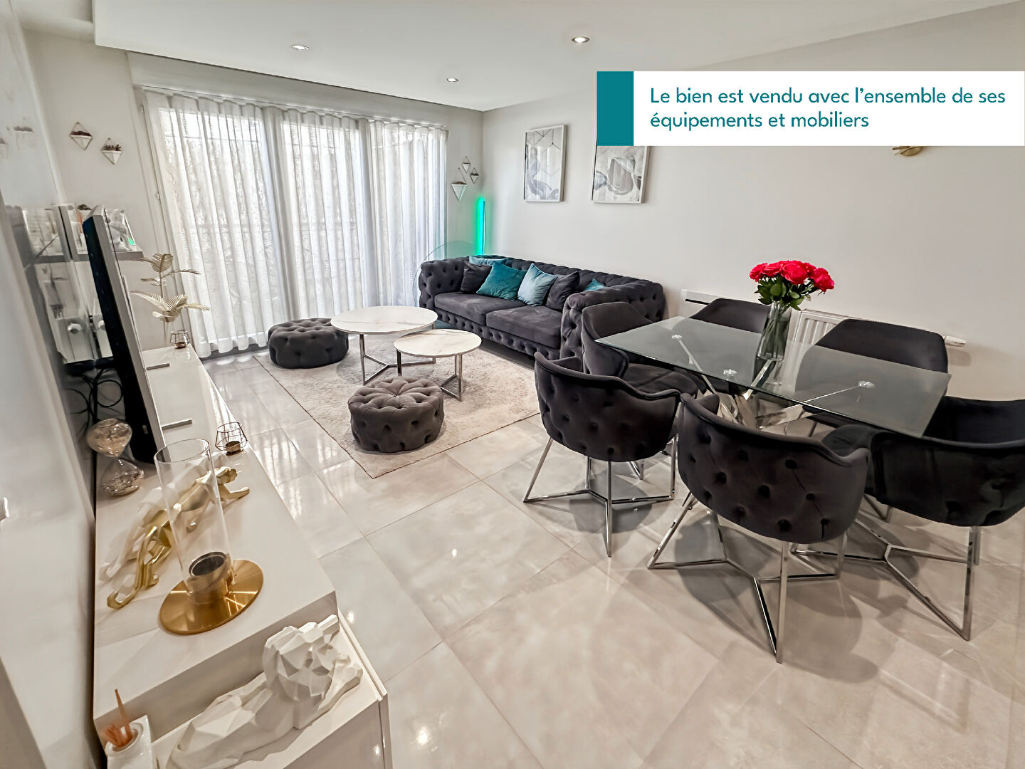 Le bien est vendu avec l'ensemble de ses équipements et mobiliers, incluant notamment deux télévisions Philips Ambilight, l'électroménager complet, ainsi que le mobilier et les éléments de décoration, permettant une installation immédiate sans travaux.