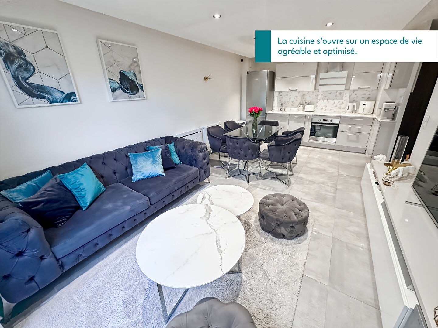 Le séjour lumineux, avec cuisine ouverte entièrement équipée avec plan de travail en quartz, s'ouvre sur un espace de vie agréable et optimisé.