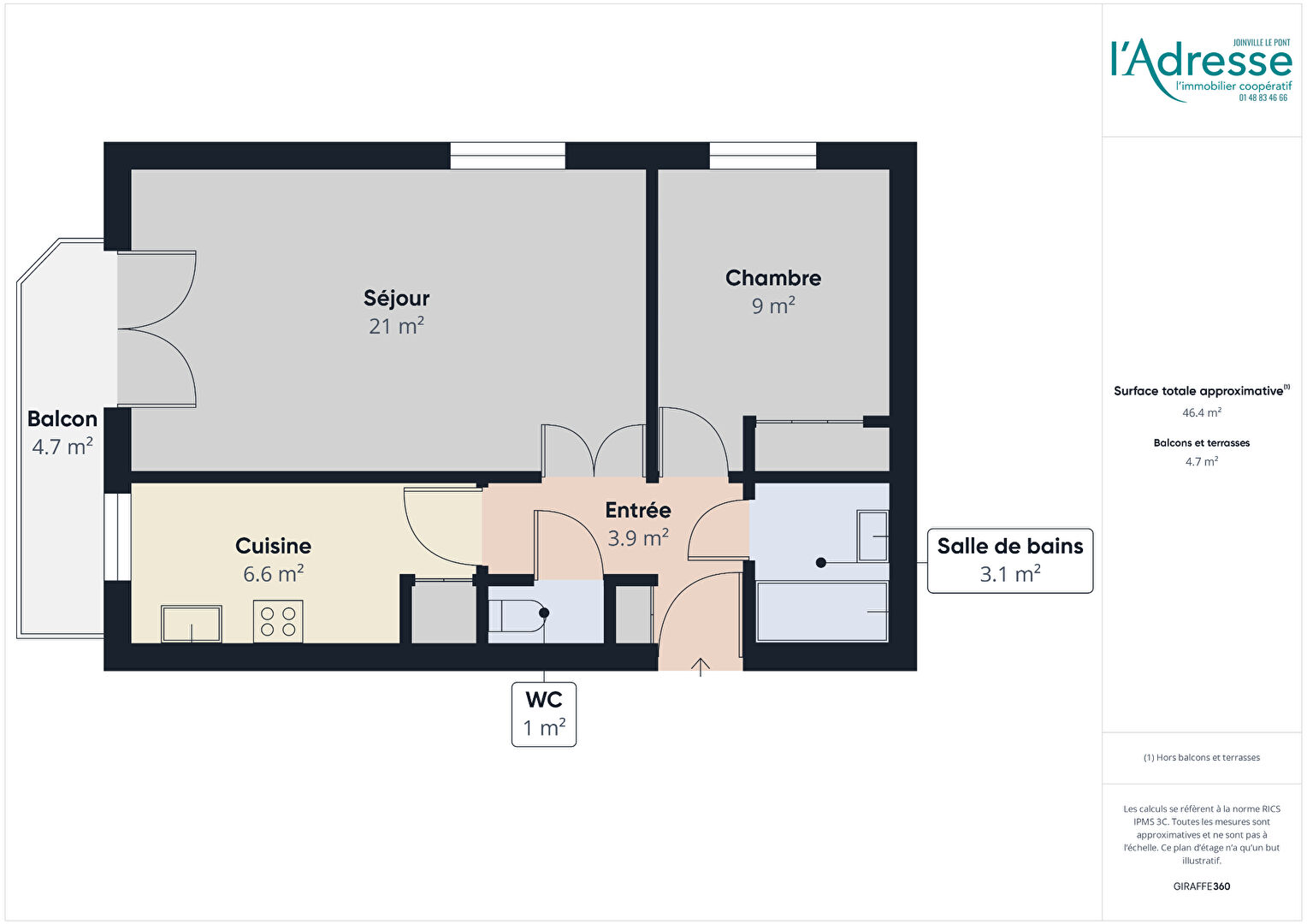 Appartement T2 de 46 m² situé à Cergy, comprenant une entrée avec rangement, un séjour donnant accès a un balcon, une cuisine indépendante, une chambre avec placard et une salle de bains.
