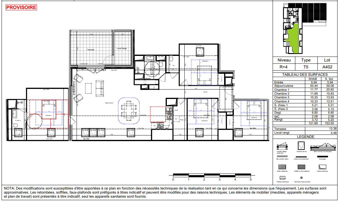 A VENDRE  très beau Type T5 neuf de 121.69 m²  (153.50 m² au sol) situé  au 4ème et dernier étage dans cette élégante résidence  comprenant une entrée, un  séjour cuisine  de 50.44 m² m²  exposé Sud Ouest et ouvert sur une terrasse de 13.38 m², quatre chambres de 10.23 m² à 11.77  m²  dont une avec salle d'eau privative, une seconde salle d'eau de 5.21 m², un second WC et un rangement de 3.72 m². Un cellier  supplémentaire sur le pallier de 5.48 m²  ainsi qu'une place de parking privative et sécurisée complètent les lieux, le tout bénéficiant du label Energie RE2020 seuil 2025, norme PMR, chauffage PAC option rafraichissement,...