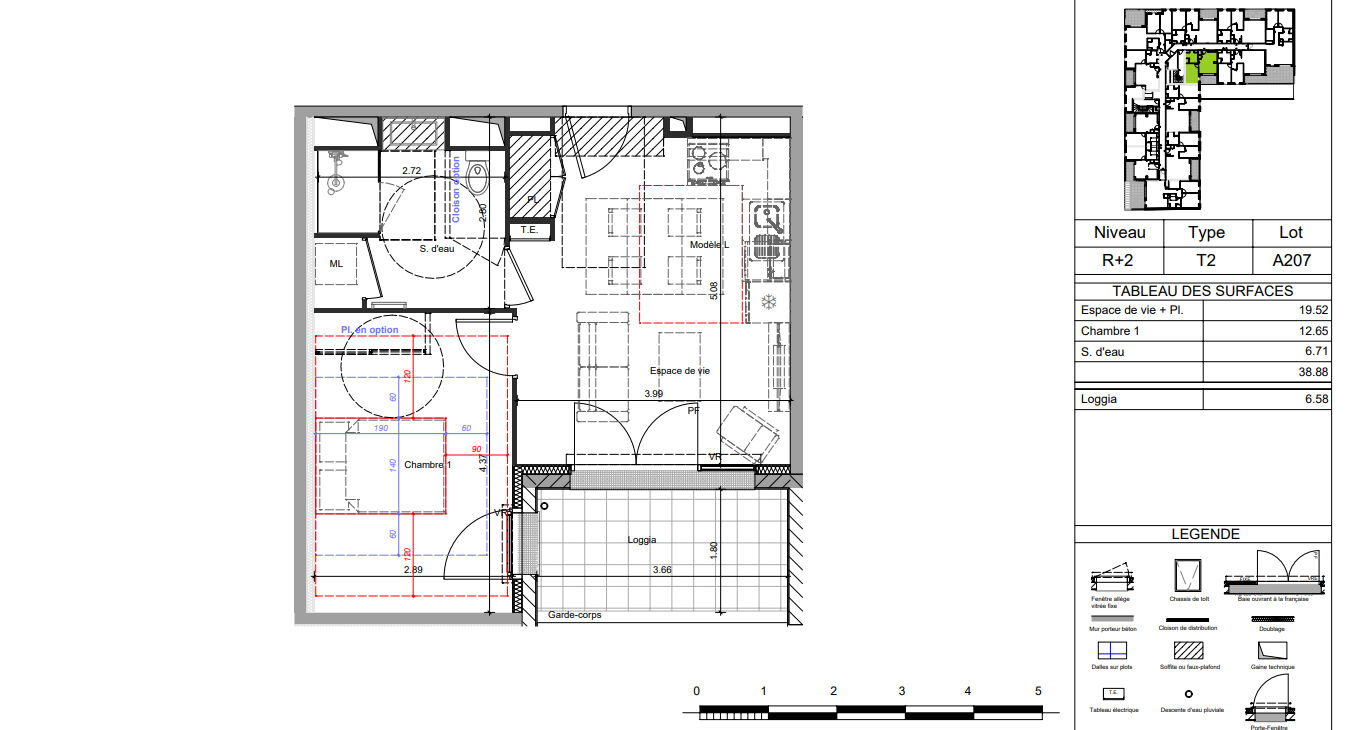 A VENDRE Type T2 neuf de 38,88m² situé au 2ème étage dans cette élégante résidence comprenant une entrée avec placard, un séjour cuisine de 19,52m² ouvert sur une loggia de 6,58m², une chambre de 12,65m² et une salle d'eau WC de 6.58m² . Une place de parking privative et sécurisée complète les lieux, le tout bénéficiant du label Energie RE2020 seuil 2025, norme PMR, chauffage PAC option rafraichissement, ...