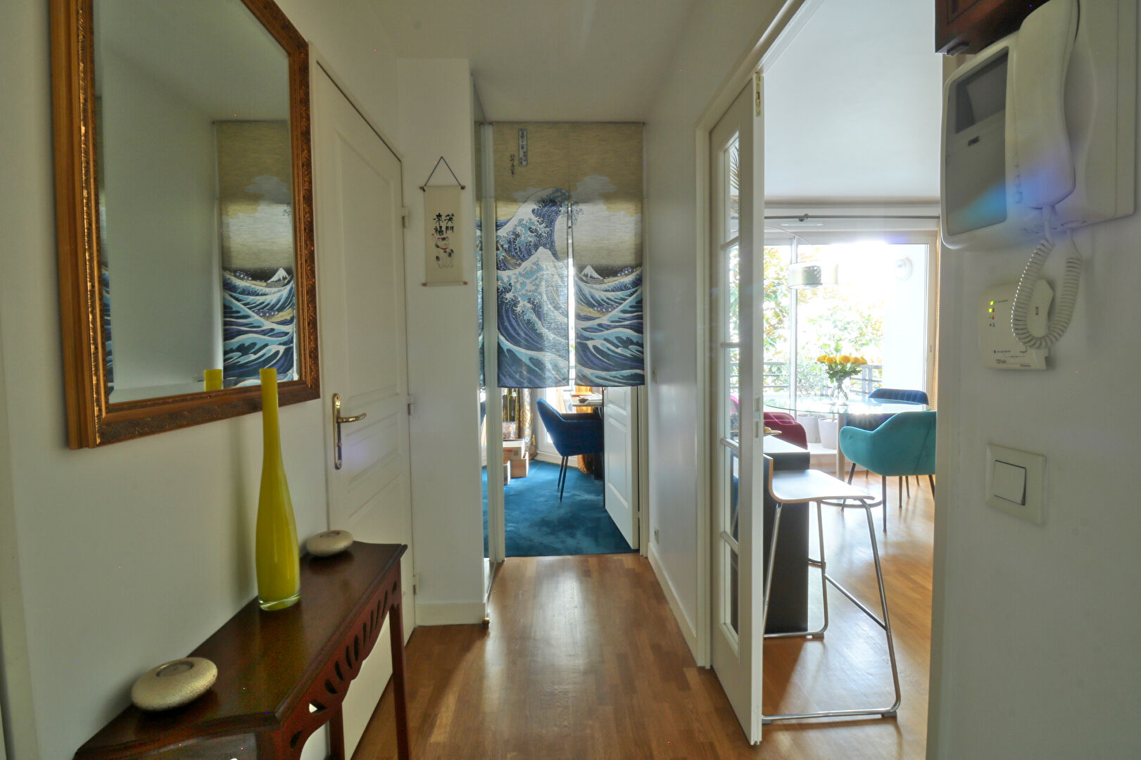 Entrée avec placards, séjour cosy donnant directement sur l'extérieur permettant d'accueillir plusieurs personnes, cuisine ouverte équipée impeccable.