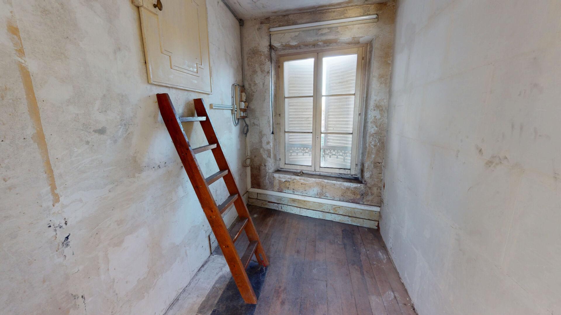 Une entrée desservant un séjour de plus de 25m2 très lumineux, une cuisine indépendante meublée, une salle d'eau avec WC, une chambres avec des rangements, une pièce à aménager avec un accès direct sur des combles.