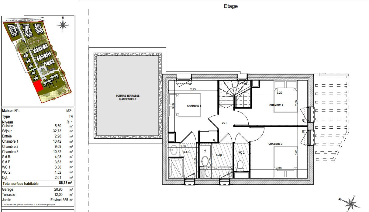 Cette maison T4 offre une surface habitable de 86,78m². Elle comprend au RDC un séjour cuisine d'environ 38m² ouvrant sur une terrasse de 12m² , un WC. A l'étage trois chambres, une salle de bains, une salle d'eau et un second WC. Le jardin d'environ 355m² est engazonné, et une place PMR est aménagée à l'avant du garage attenant à la maison La parcelle est entièrement clôturée.