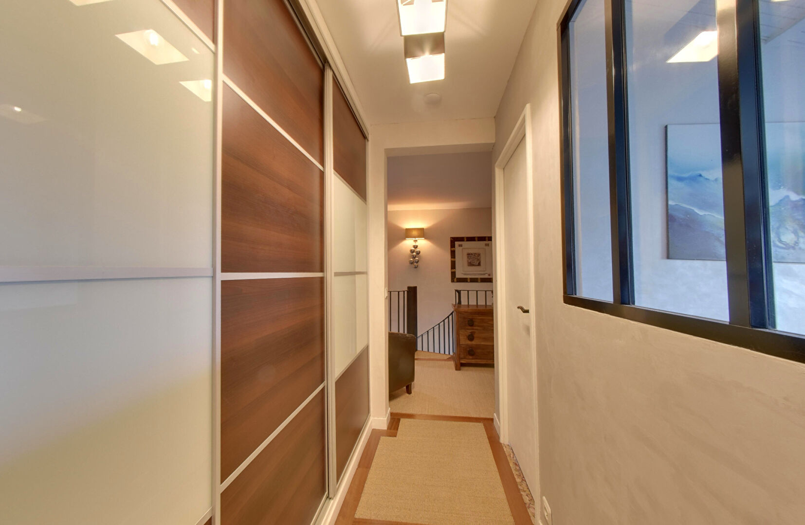 Côté agencement, il offre au premier niveau : une grande entrée avec placard, WC indépendant, une chambre avec salle d'eau, une cuisine aménagée et équipée Lapeyre, et un vaste salon/séjour avec élégant parquet en teck ;
