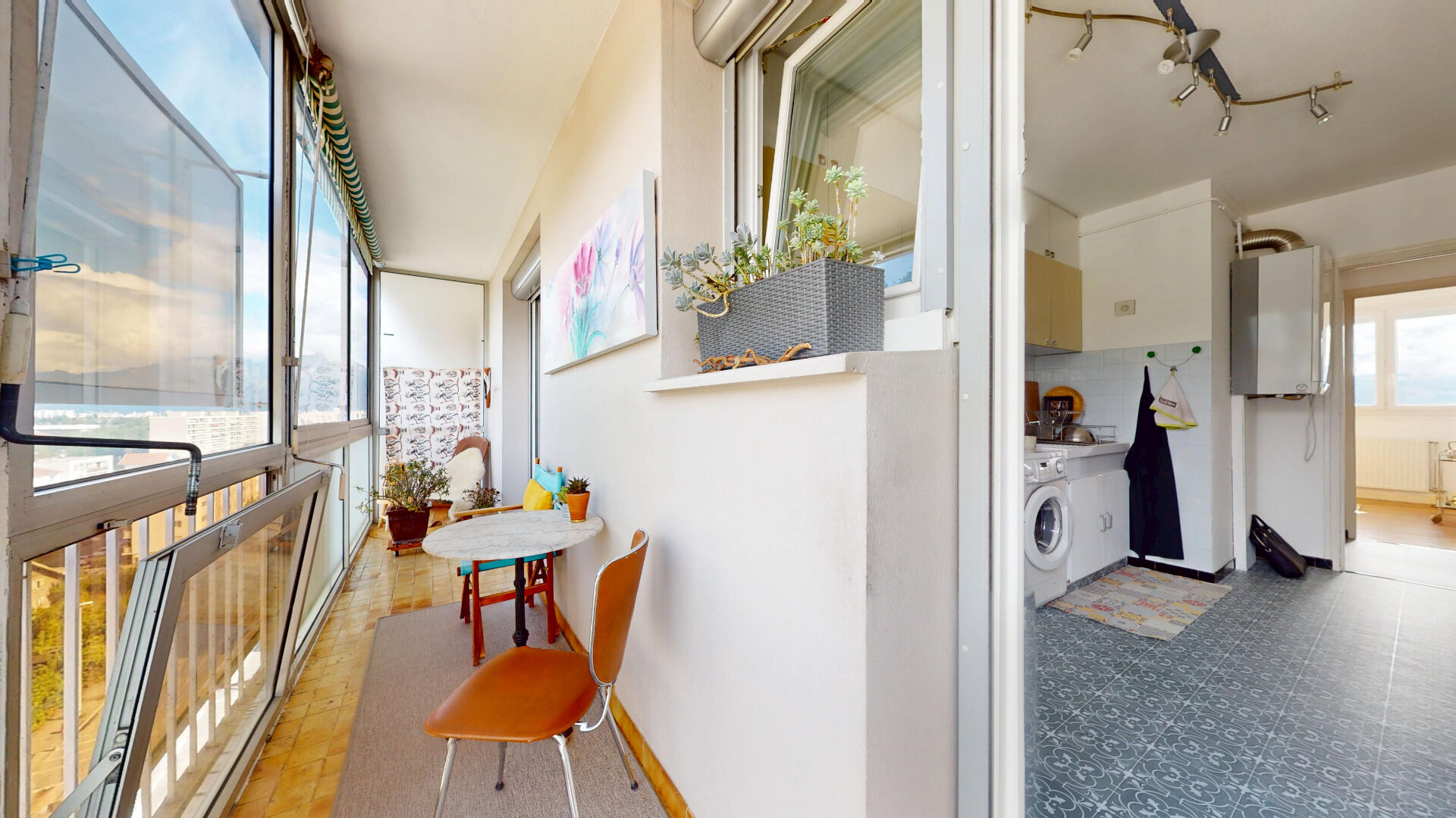 La cuisine et le salon donnent accès sur un balcon fermé d'environ 8M².
