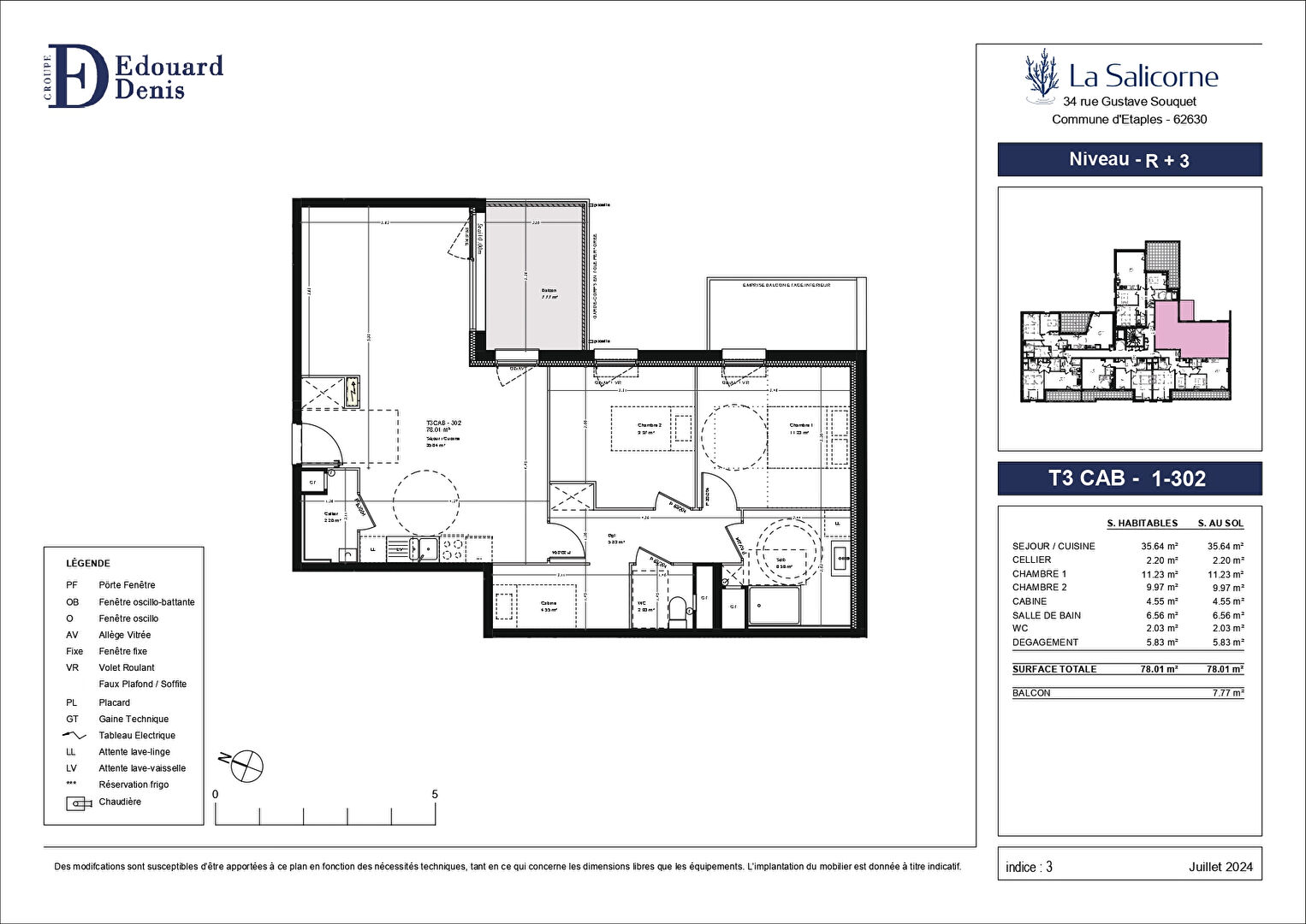 Appartement Etaples 3 pièces cabine 78.01m² + balcon 7.77m²