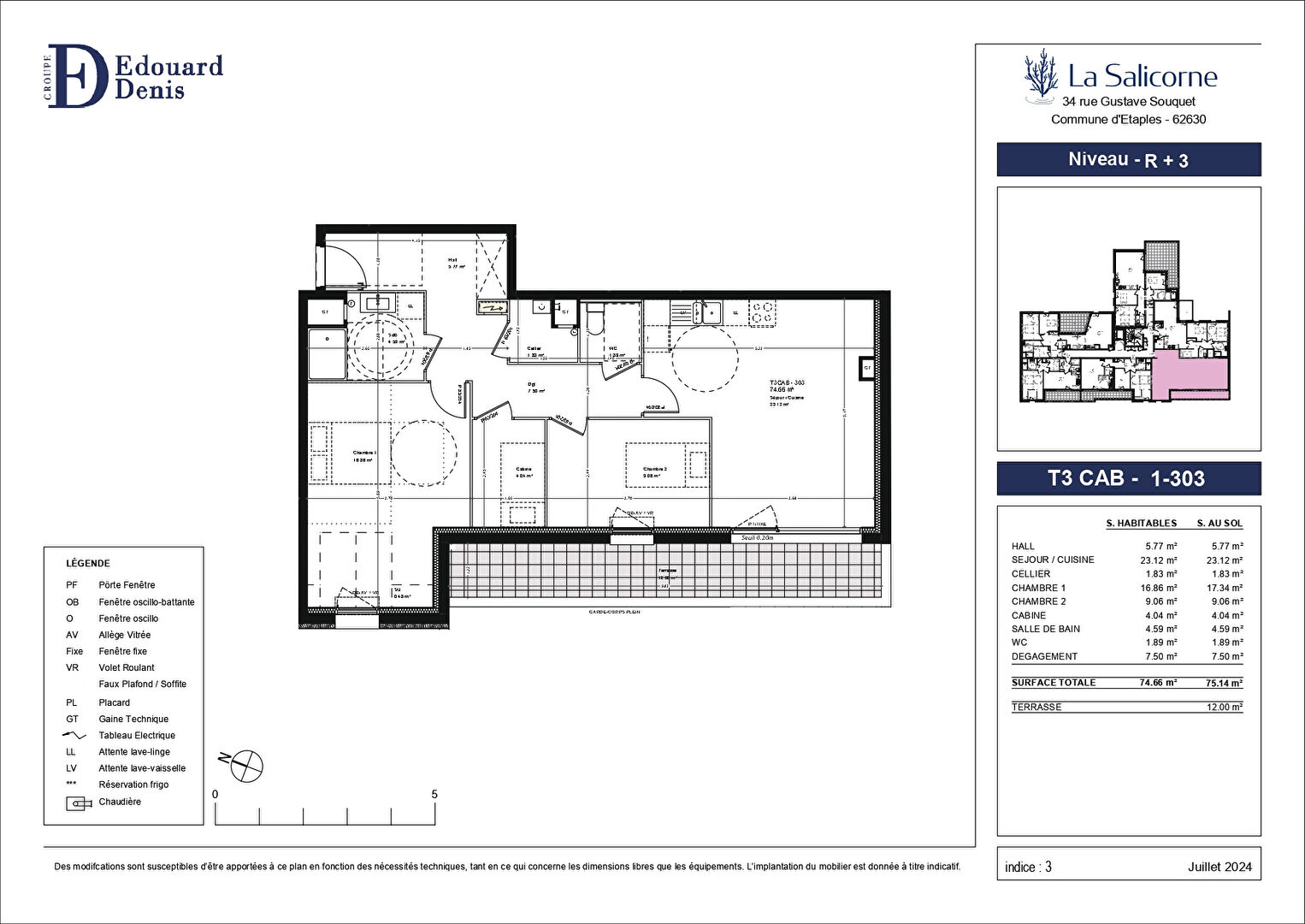 Appartement Etaples 3 pièces + cabine 74.66m² + terrasse 12m²