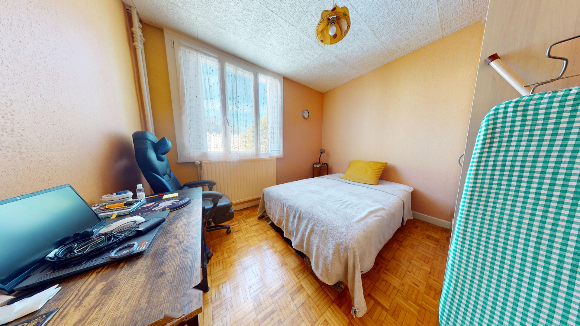 Il se trouve au quatrième étage d'un immeuble équipé d'un ascenseur en demi-palier.