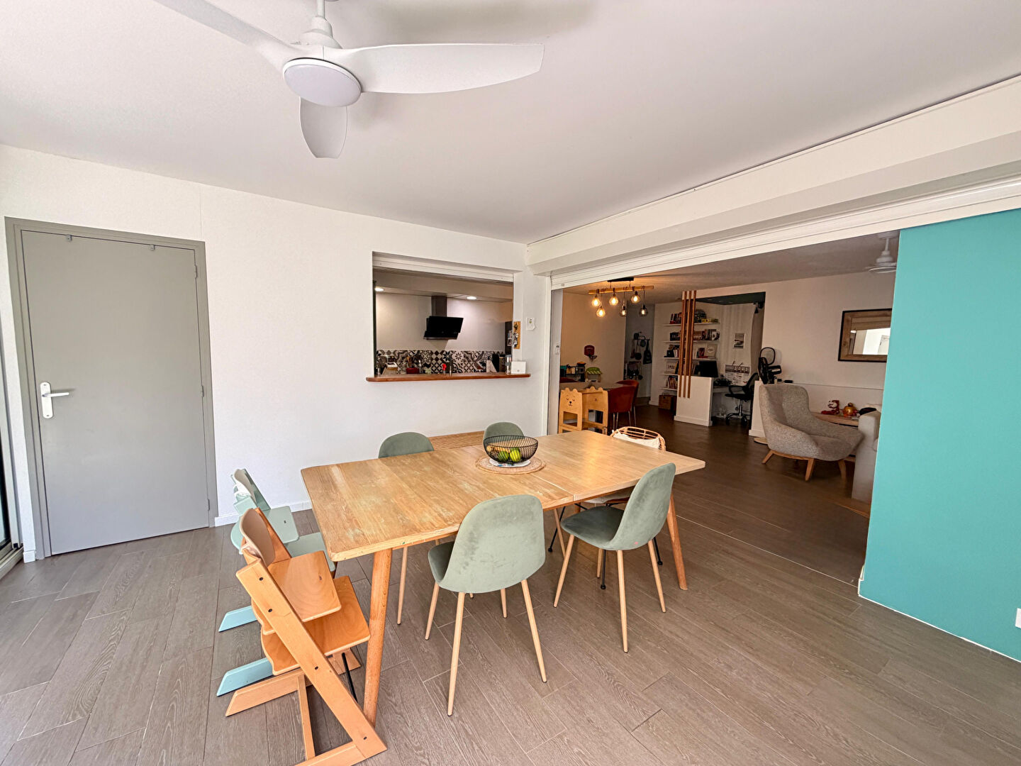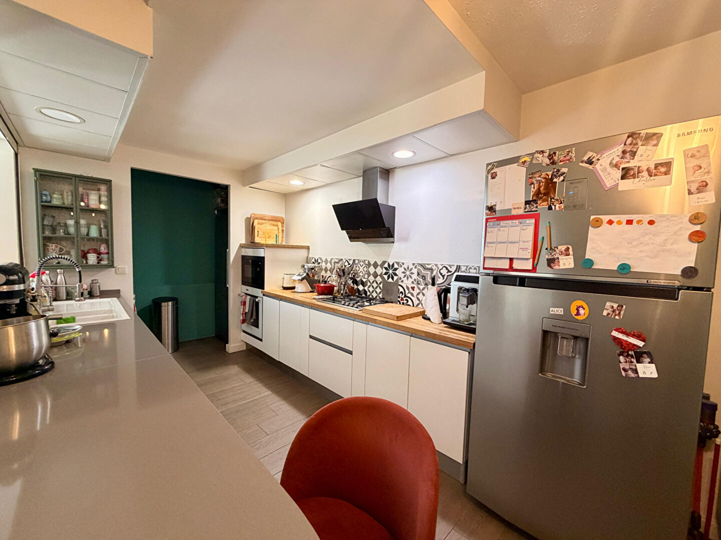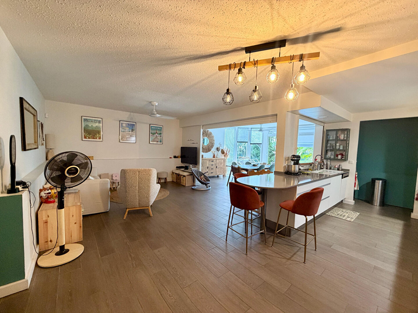 Espace de vie : Un vaste séjour lumineux avec coin bureau, ouvert sur une cuisine américaine aménagée et son cellier attenant.