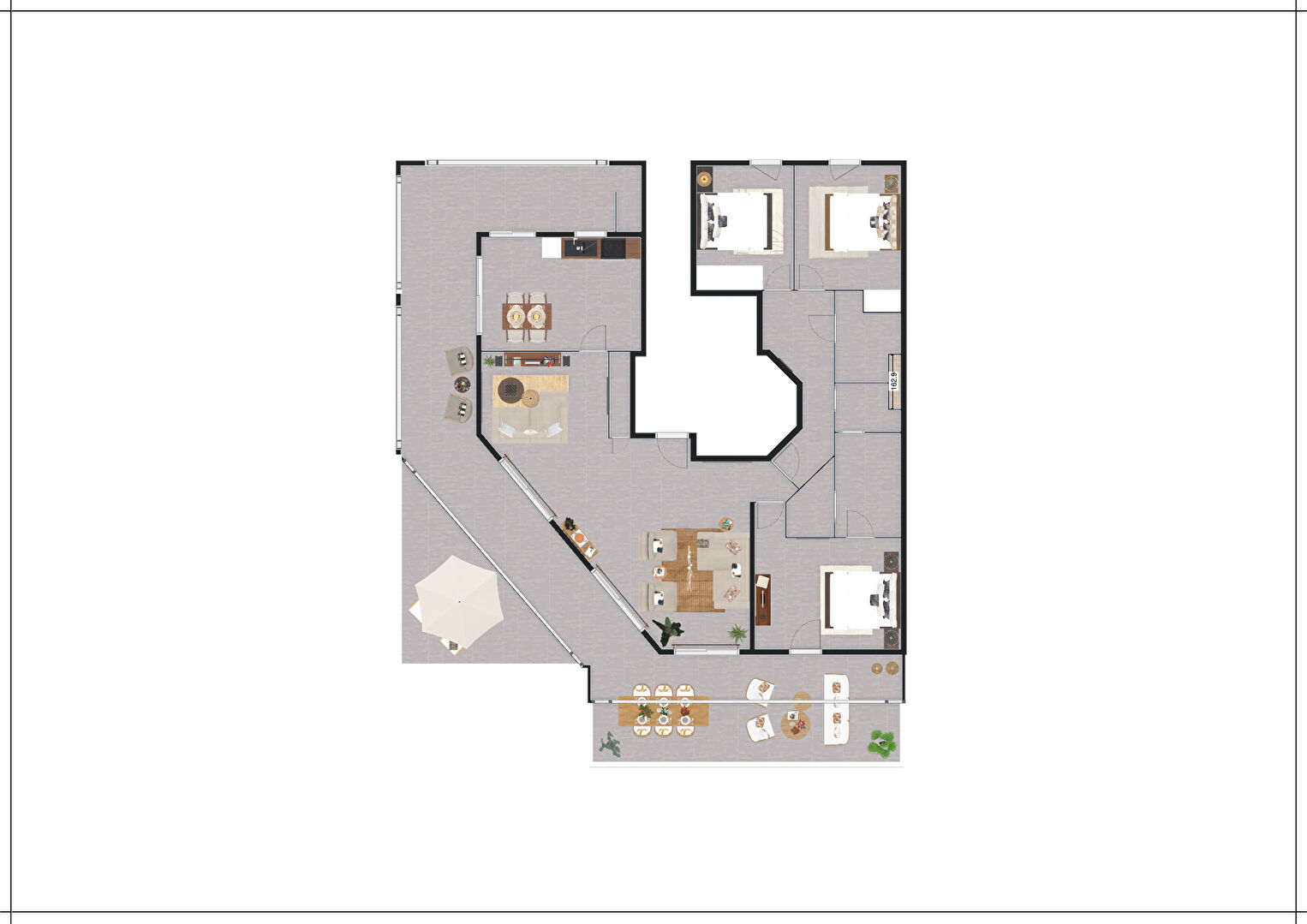 Sa terrasse très généreuse de plus de 90 m² permet des accès multiples: à la fois de l'espace de vie très spacieux ,et sur l'autre aile, du coint nuit avec une entrée directe sur la suite parentale.
