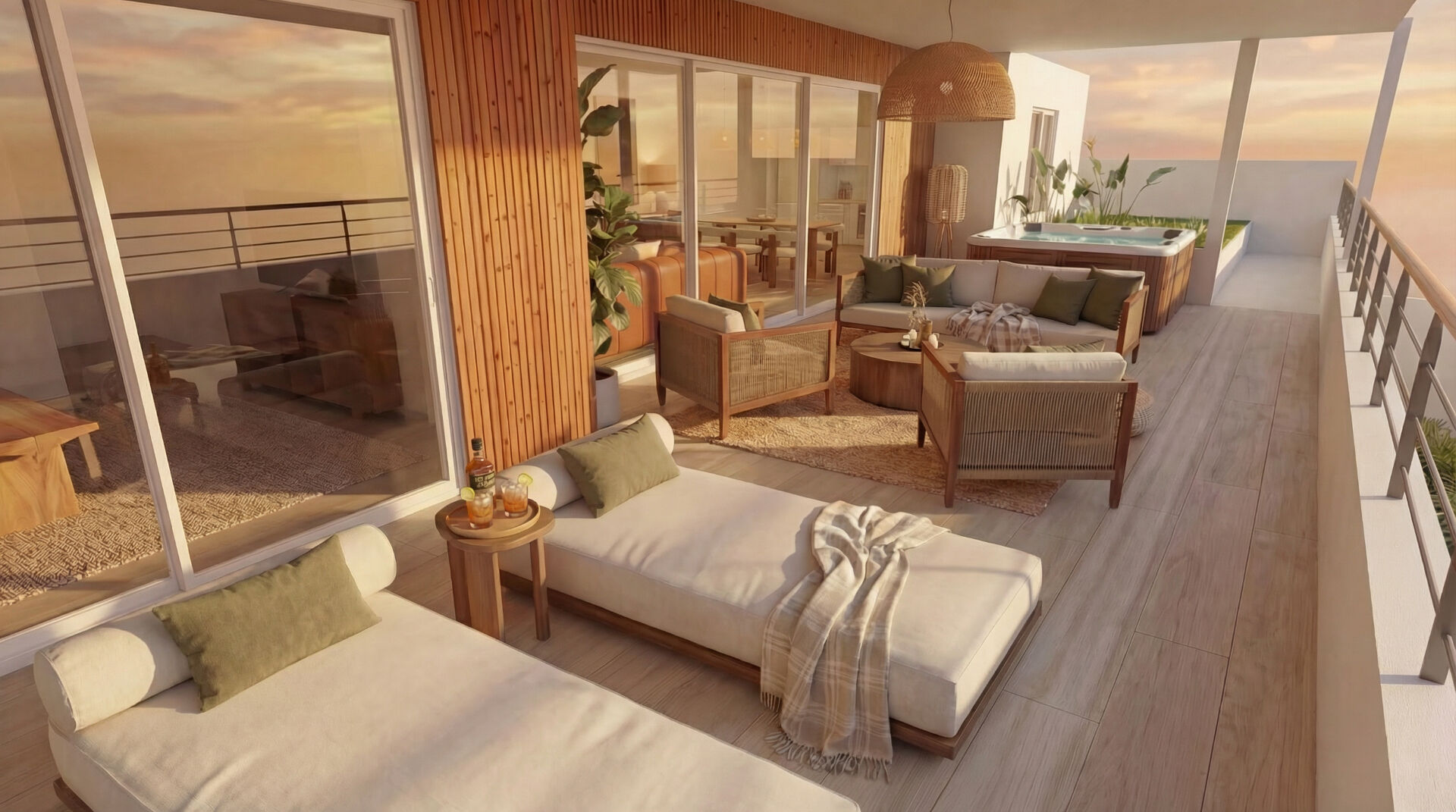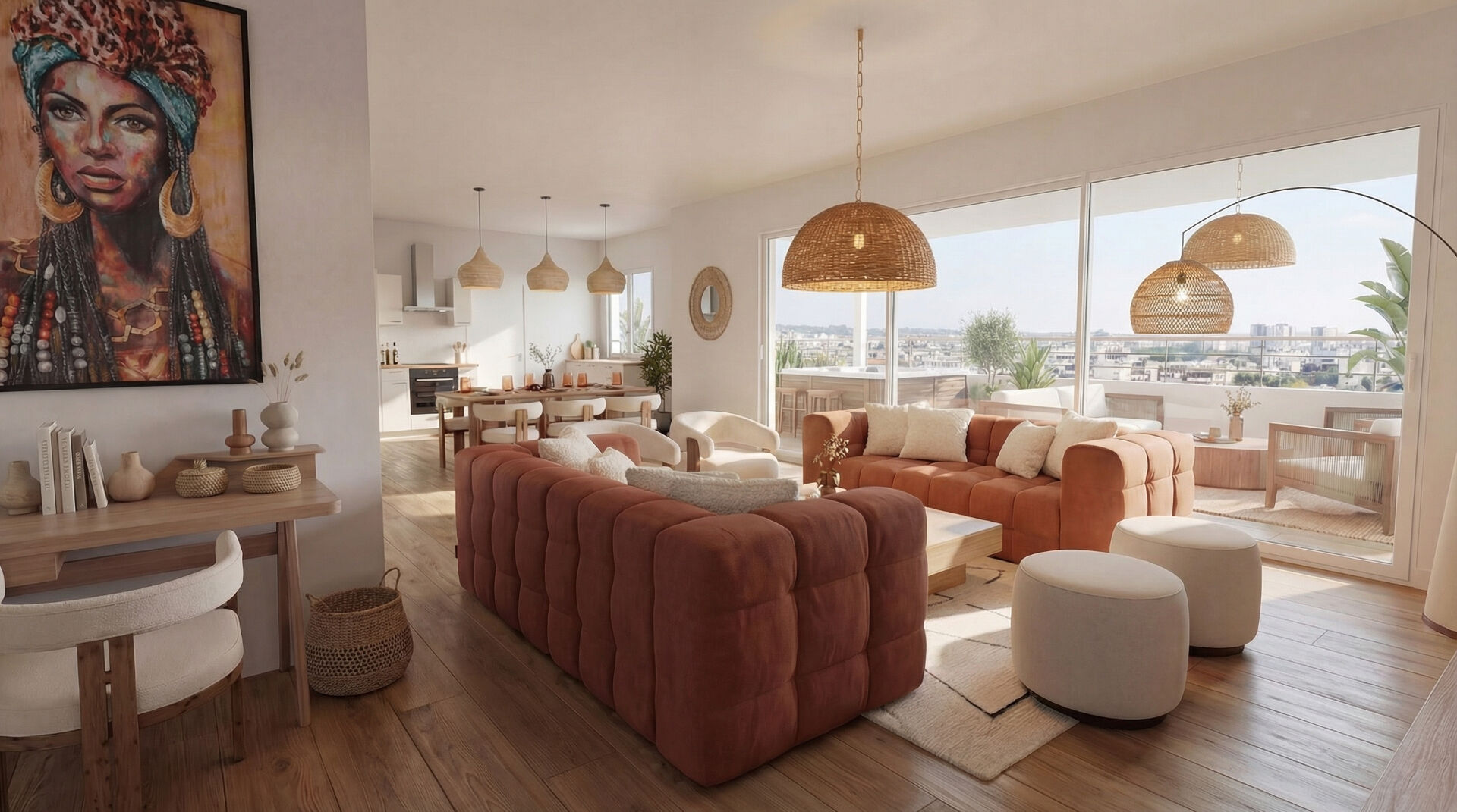 D'une superficie habitable de plus de 134 m², cet appartement aux finitions contemporaines très soignées , apporte une touche de modernité réchauffée par le carrelage effet bois dans le séjour- cuisine prolongée sur la terrasse par un revêtement mural de style balinais.