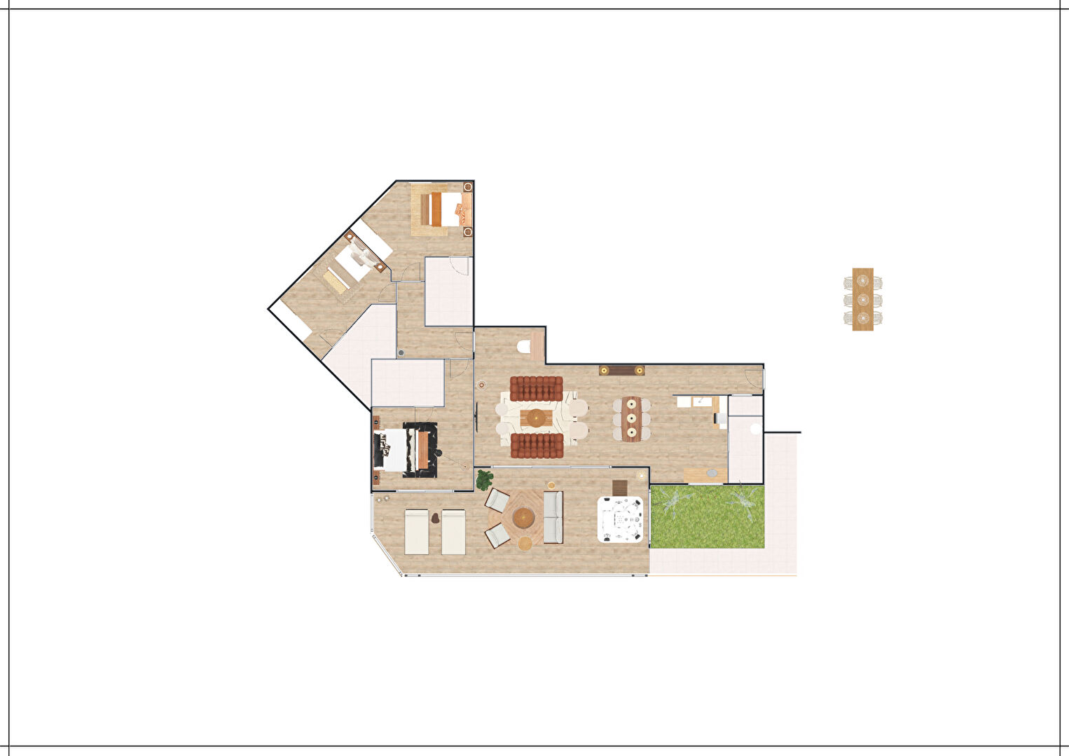 Sa terrasse très spacieuse, conçue pour recevoir un jacuzzi permet également l'aménagement d'un joli jardin dans un espace prévu à cet effet.