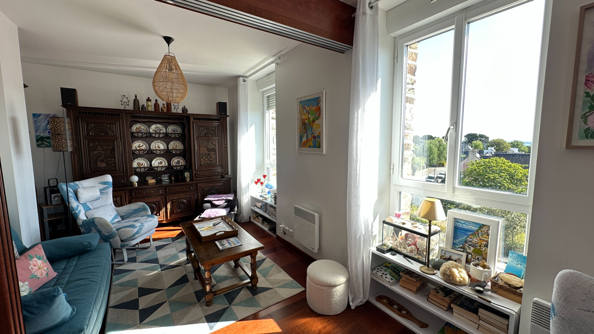 La pièce de vie donne un aperçu sur une jolie petite vue mer.