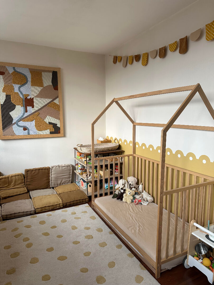Premier niveau : une cuisine américaine qui ouvre sur un salon chaleureux, une chambre.