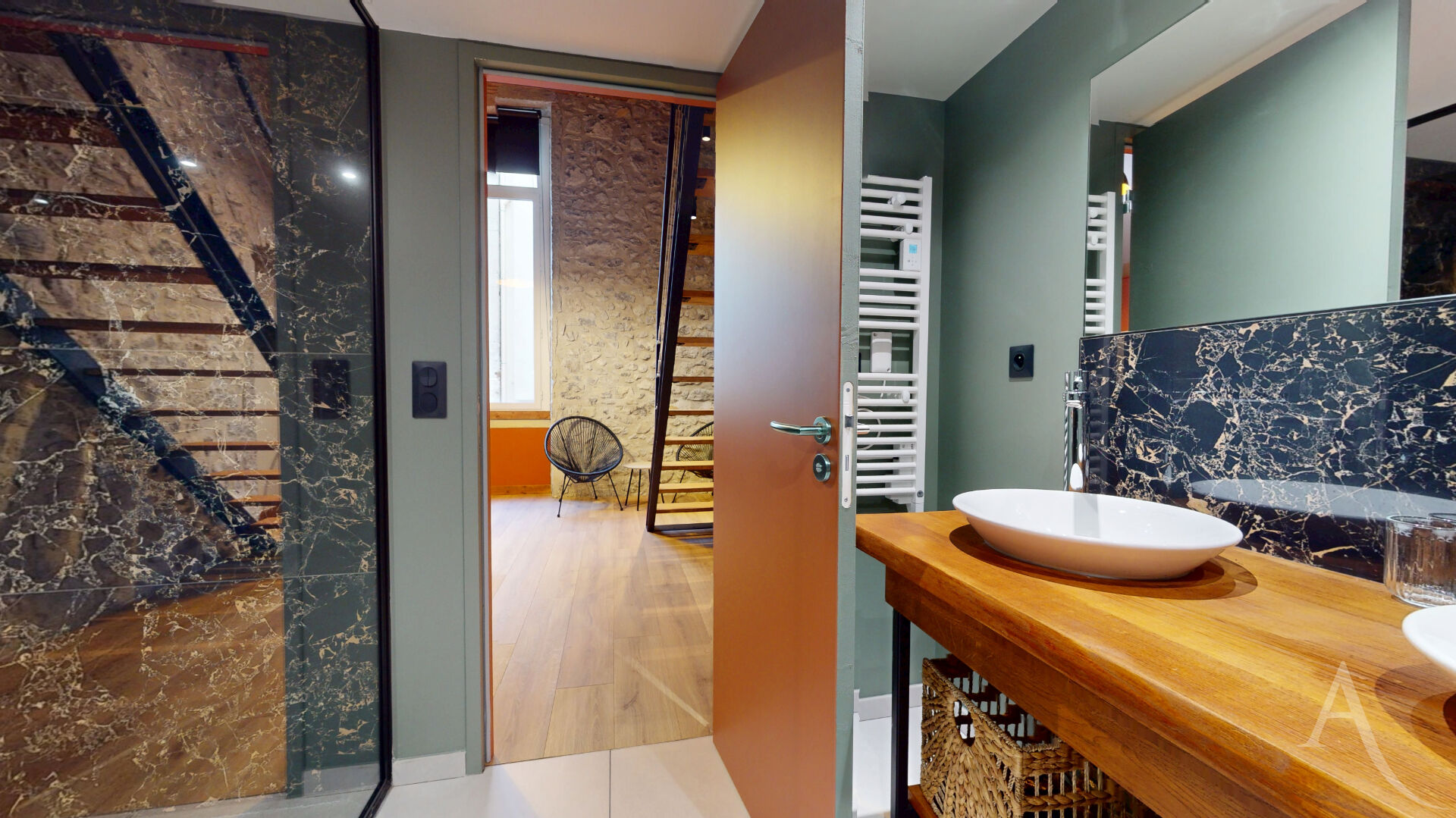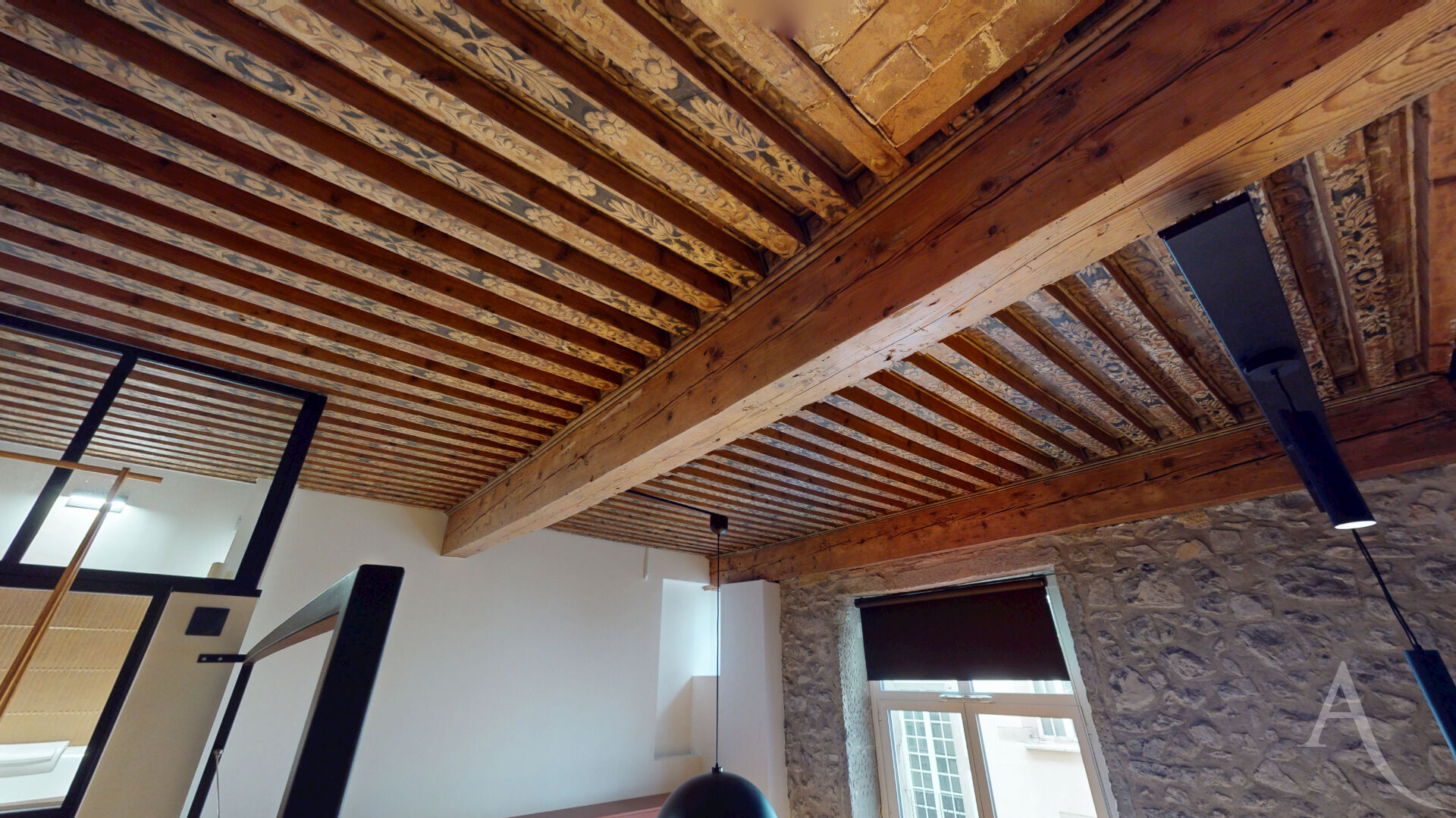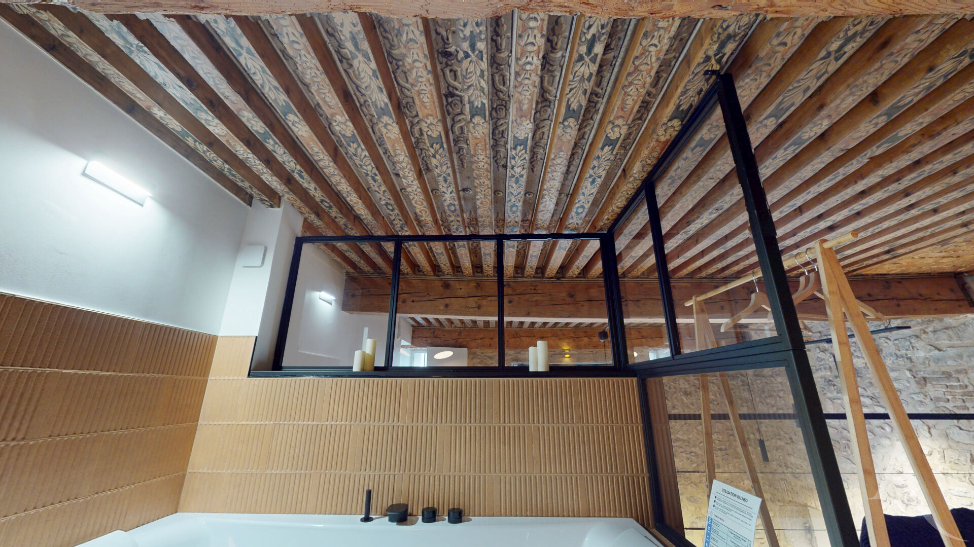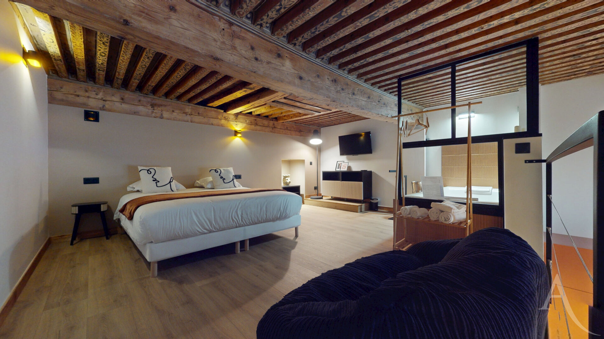 Les poutres anciennes peintes à la main, la pierre apparente et les matériaux nobles racontent l'histoire du lieu tout en offrant une atmosphère chaleureuse et raffinée. Chaque détail a été pensé avec goût pour sublimer ce cocon unique.